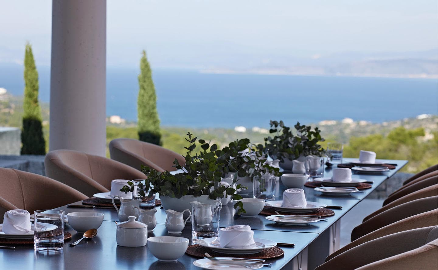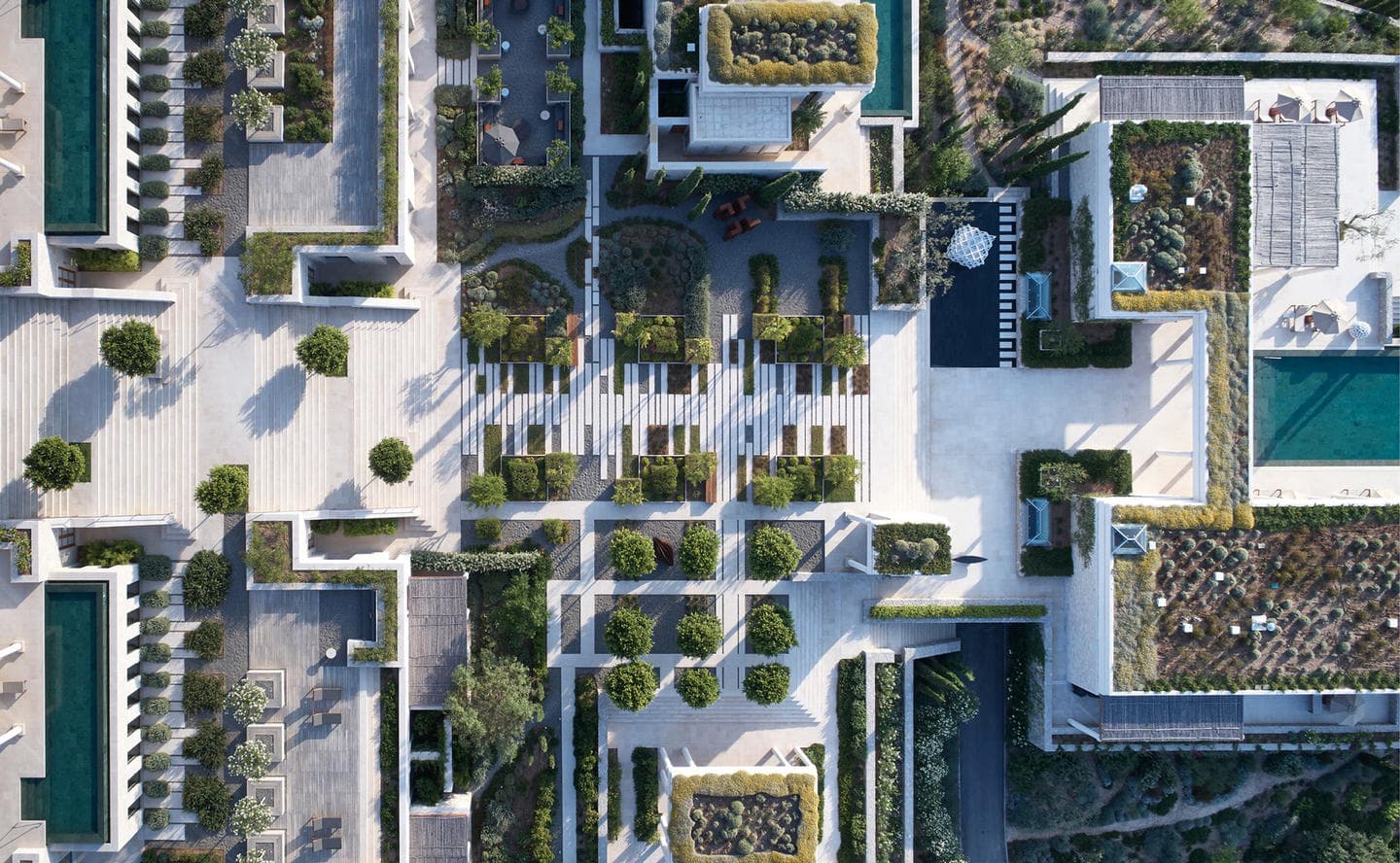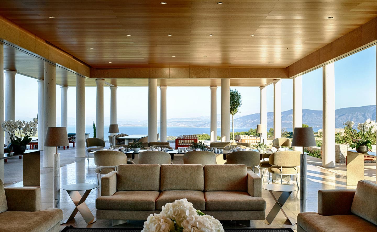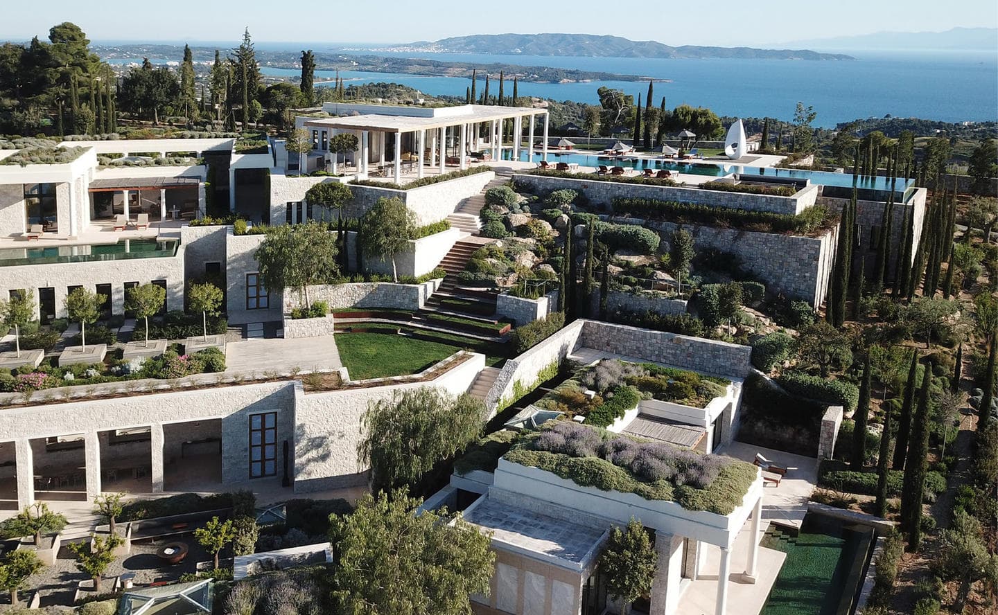 Отель Amanzoe расположен в живописном уголке полуострова Пелопоннес. 38 уединенных вилл построены на холме, откуда открываются захватывающие виды на полуостров и Эгейское море. Интерьеры выполнены в светлых тонах, в отделке использованы натуральные дерево и камень. Благодаря открытой планировке, комнаты очень просторные и светлые. Каждая вилла оборудована персональным бассейном.