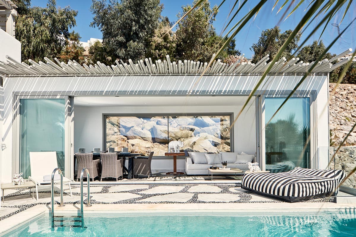 На южном побережье острова, в местечке Элия, в 20 минутах езды (12 км) от аэропорта Миконоса.