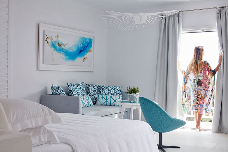 True blue room (28 кв. м): балкон или терраса, спальня с кроватью king-size или двумя отдельными кроватями, ванная комната. Номера имеют открытую планировку, спальная и ванная зоны не разделены. Вид на море.