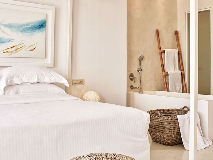 Thalassa suite with jacuzzi (45 кв. м): терраса с джакузи на открытом воздухе, спальня с гостиной зоной (кровать king-size или две отдельные кровати), ванная комната. Номера имеют открытую планировку, спальная и ванная зоны не разделены. Вид на море.
