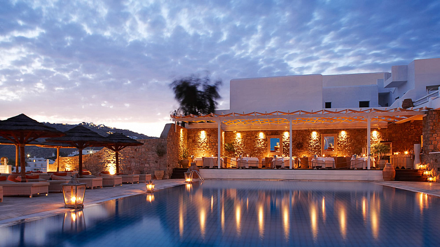 Grand blue room (35 кв. м): терраса (20 кв. м) с открытым персональным бассейном (40 кв. м), спальня с кроватью king-size или двумя отдельными кроватями, ванная комната. Номера имеют открытую планировку, спальная и ванная зоны не разделены. Расположены на вершине холма. Вид на море.