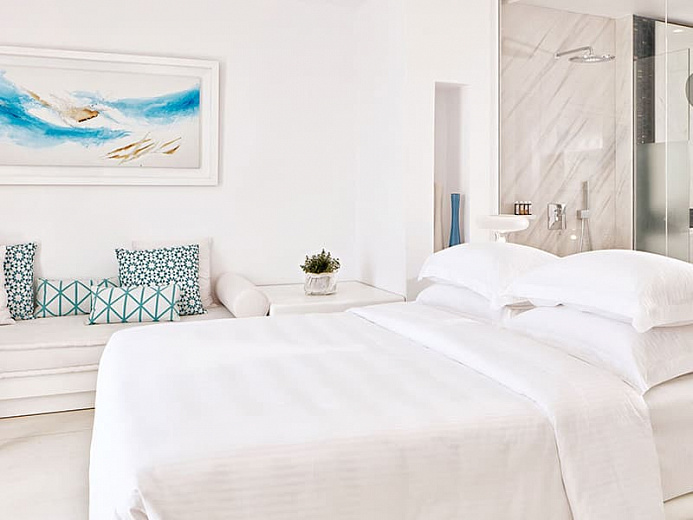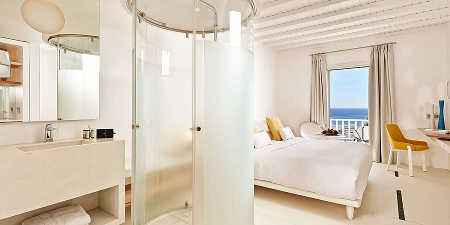 Thalassa suite (45 кв. м): балкон или терраса, спальня с гостиной зоной (кровать king-size или две отдельные кровати), ванная комната. Номера имеют открытую планировку, спальная и ванная зоны не разделены. Вид на море.