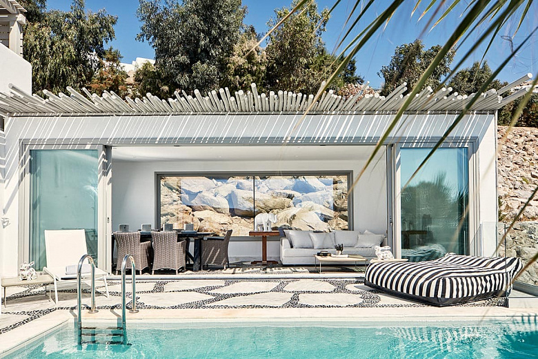 Superior room with private pool (35 кв. м): терраса с открытым персональным бассейном, спальня с кроватью king-size или двумя отдельными кроватями, ванная комната с ванной. Вид на море.