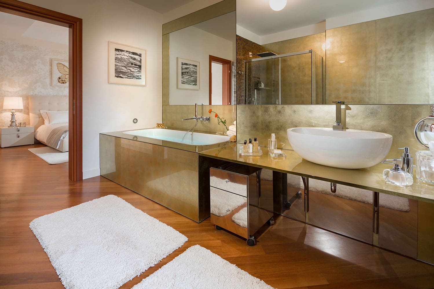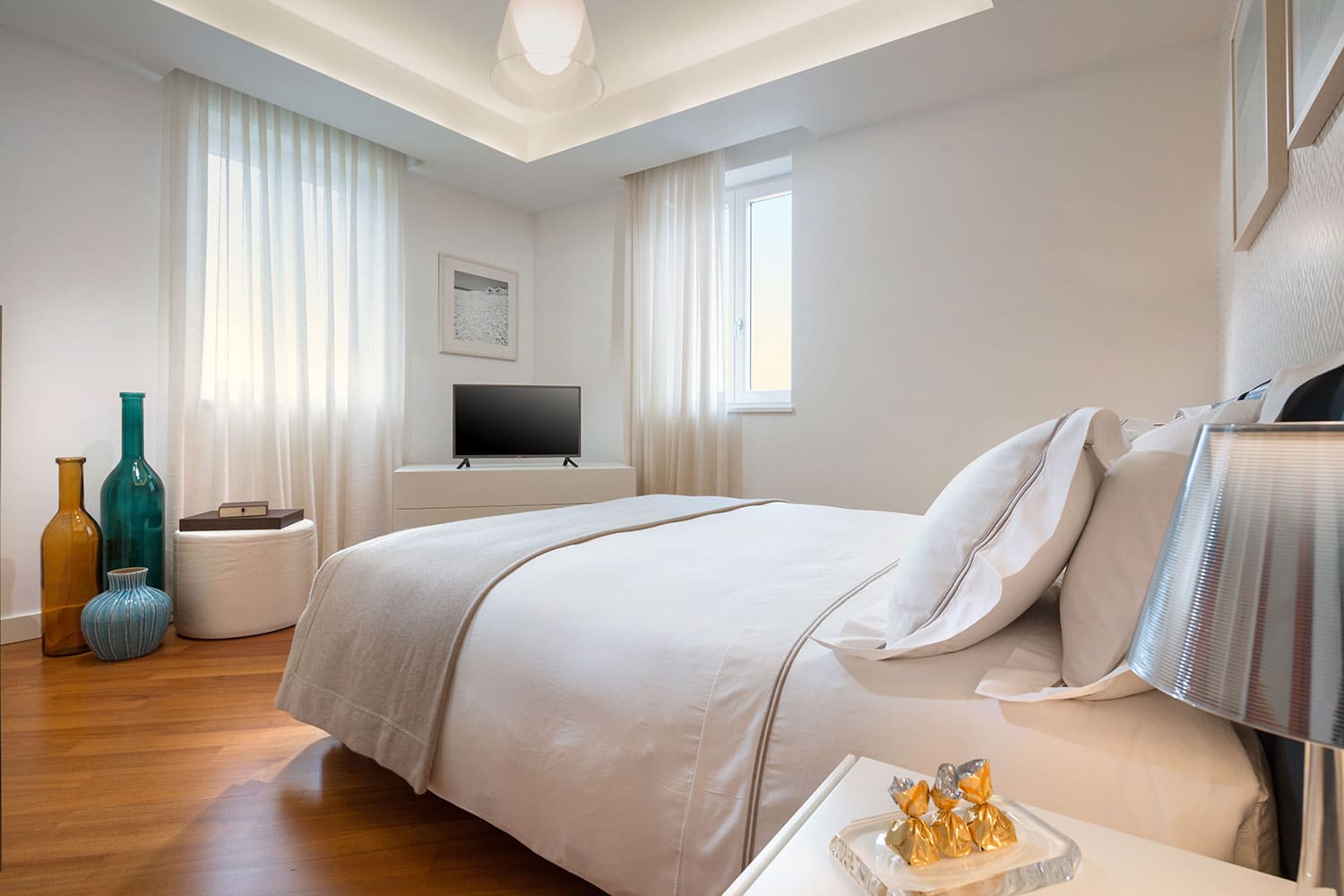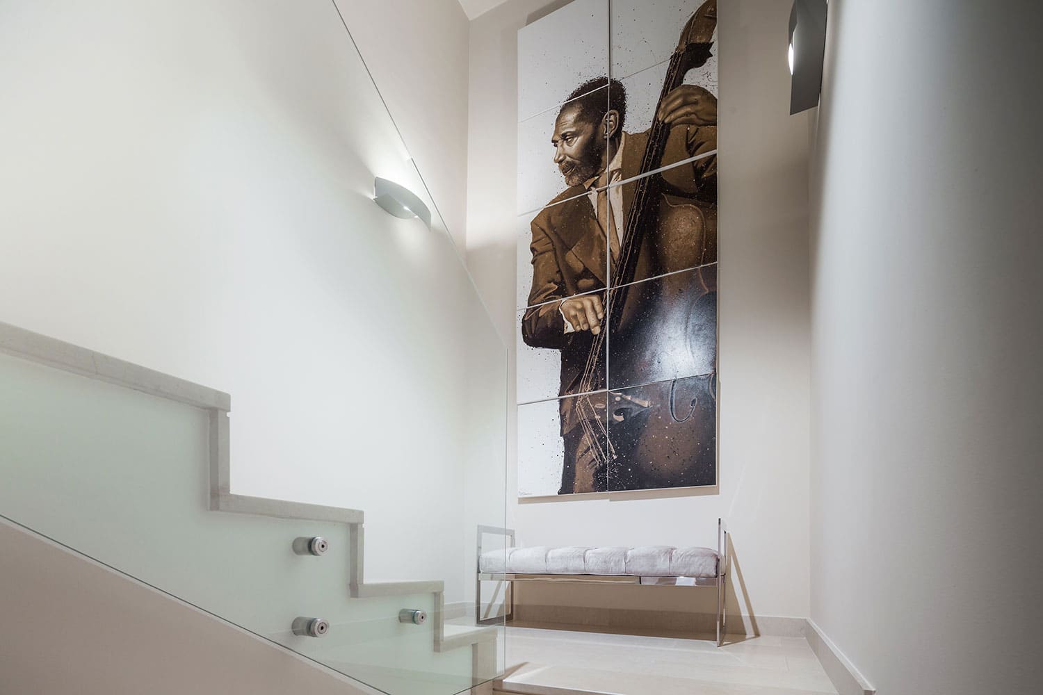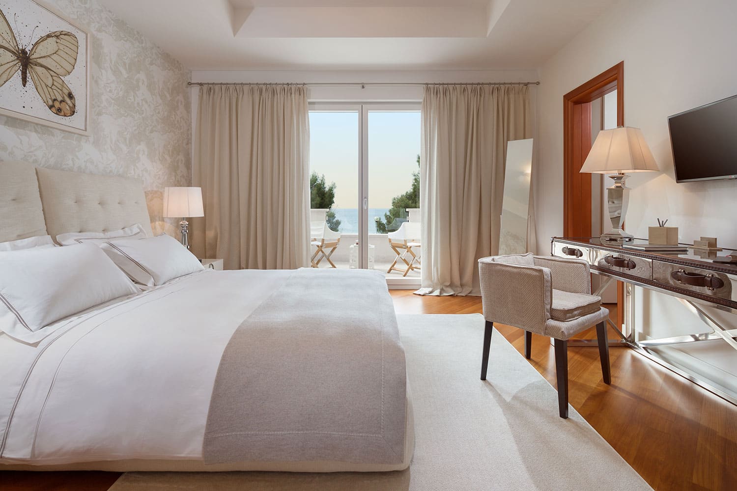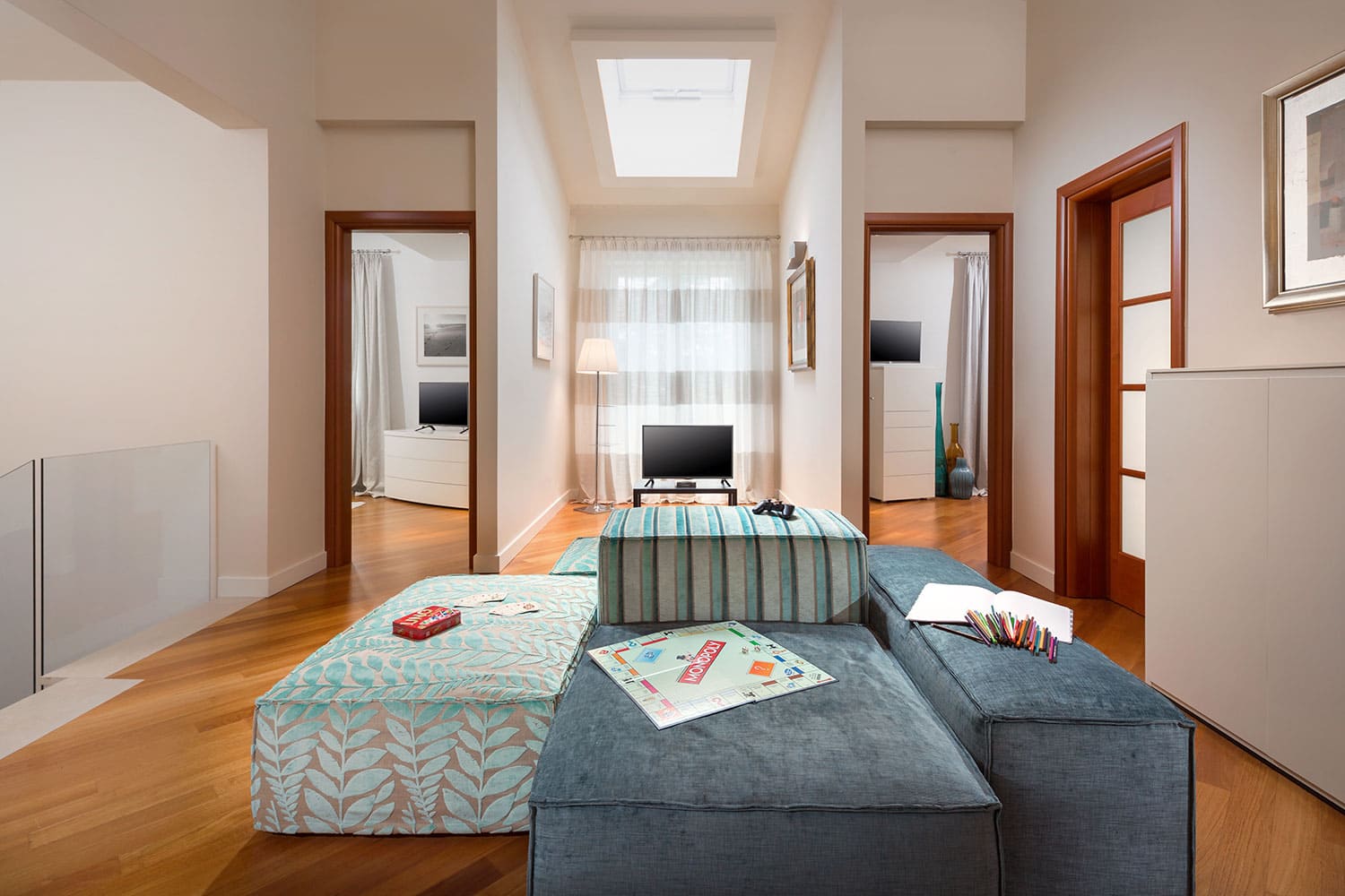 Лестница ведет с первого этажа на второй этаж, где расположены четыре спальни. Одна из них - это главная спальня с кроватью размера «king-size» и ванной комнатой с ванной и душем и выходом на собственную террасу. В остальных трех спальнях также есть двуспальные кровати, а в двух из них также есть ванная комната с душем.
