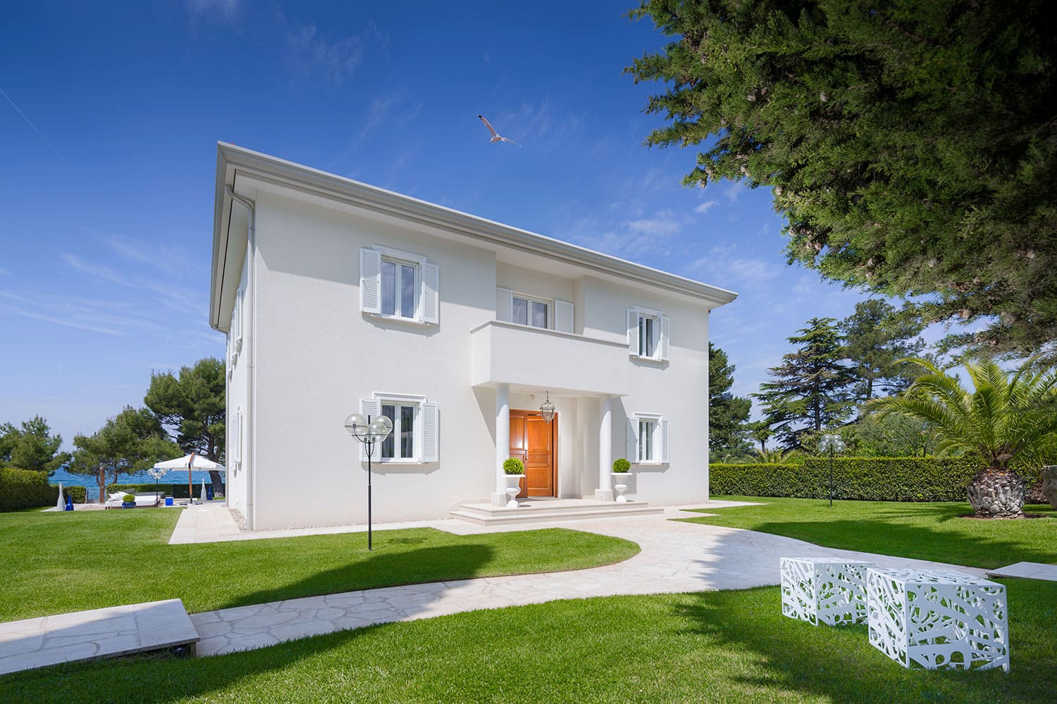Роскошная вилла Helena окружена садом с ухоженными газонами и средиземноморскими растениями. В части сада с видом на море находится бассейн с джакузи, шезлонгами и зонтиками. Из сада открывается очаровательный вид на Адриатическое море и красивые закаты. Из сада несколько ступенек ведут к крытой веранде перед домом с летней кухней с барбекю и обеденным столом на открытом воздухе.