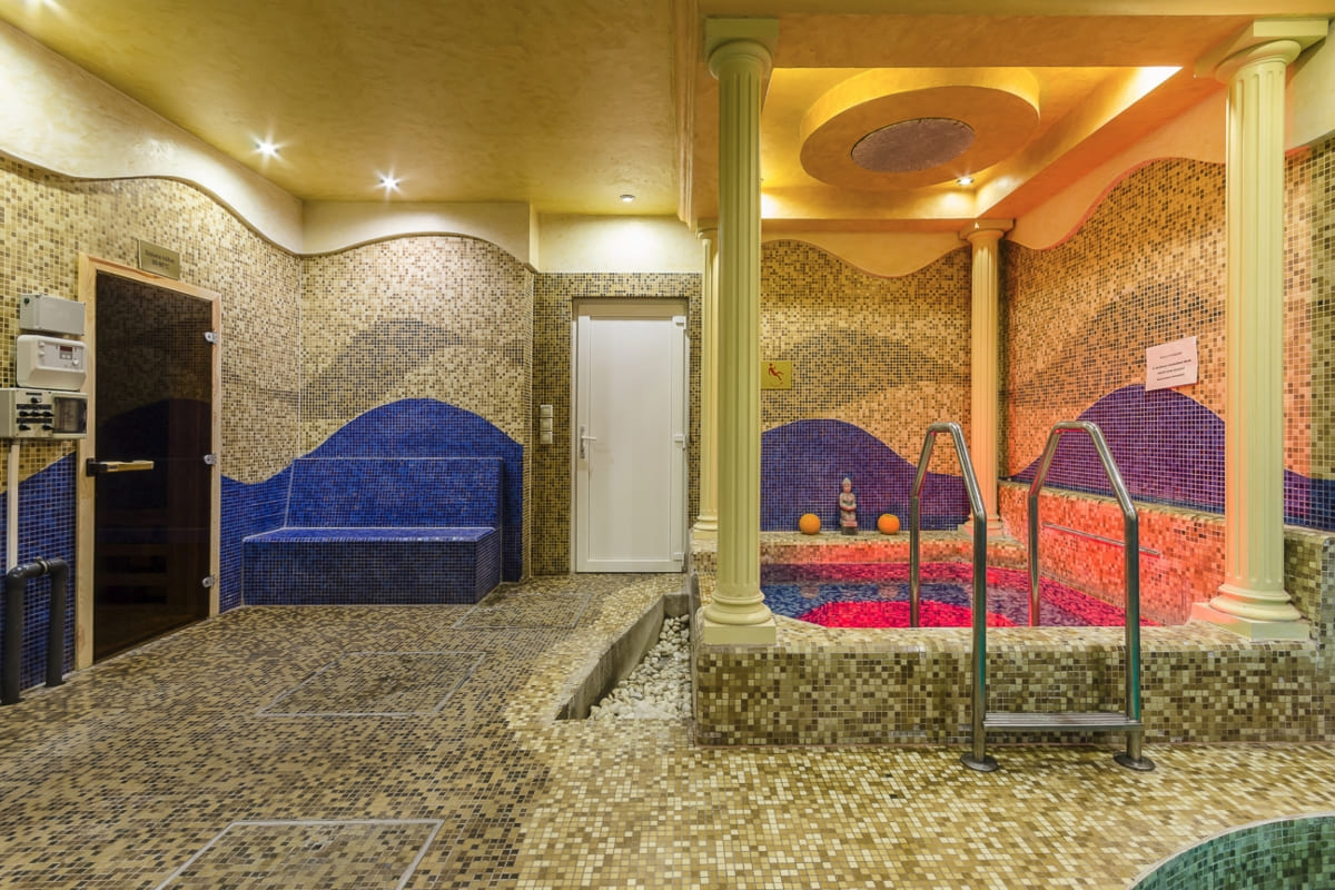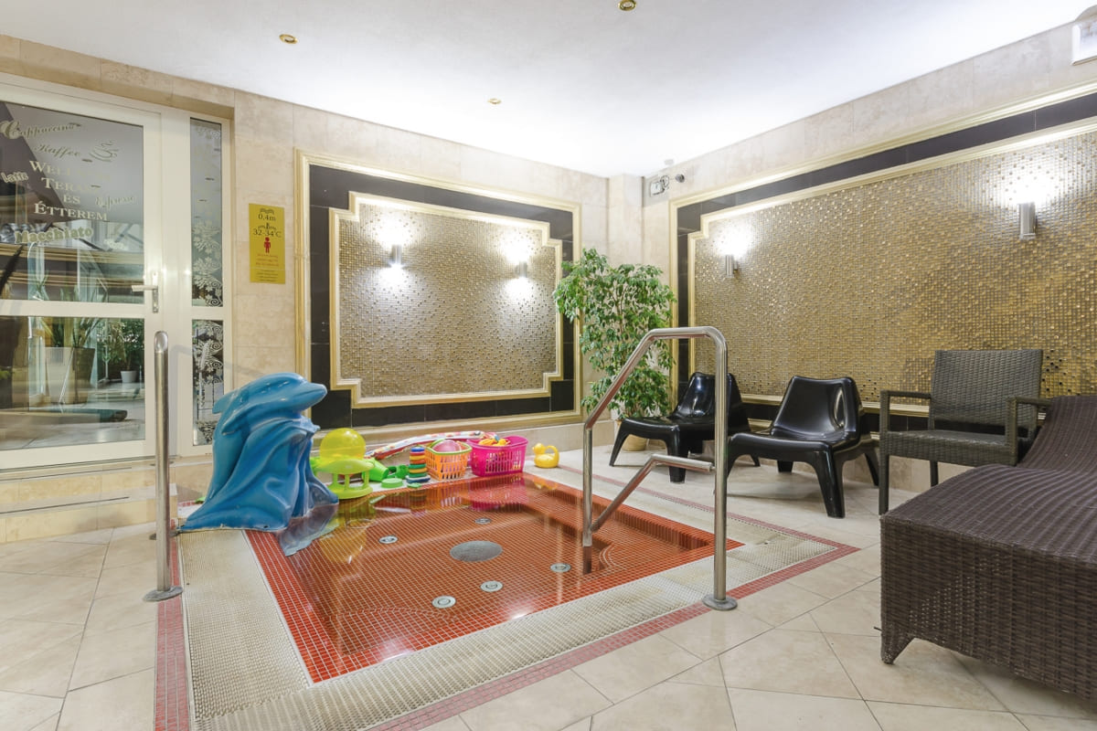 В нашем отеле велнес представлен парной, финской сауной, бассейном с гидромассажем, 2-мя бассейнами с термальной водой, детским бассейном фитнес залом. Над бассейнами расположен стеклянный купол размером в 80 кв. метров, который зимой пропускает солнечный свет, а летом данный купол можно полностью раздвинуть. Зимний сад расположен непосредственно рядом с бассейнами и рестораном. Здесь вы сможете выпить бокальчик вина или заказать прохладительные напитки. Летом для гостей открыты терассы где с утра до вечера можно загорать.