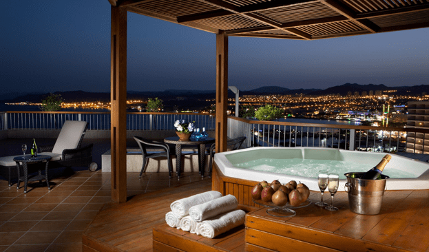 Eilat Room (29 кв. м). Балкон или терраса, гостиная зона, спальня с двуспальной кроватью, ванная комната. Вид на залив.