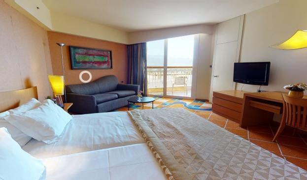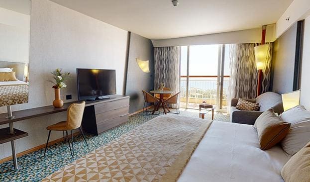 New Superior Room (34 кв. м). Балкон, гостиная зона, спальня с двуспальной кроватью, ванная комната. Вид на море.