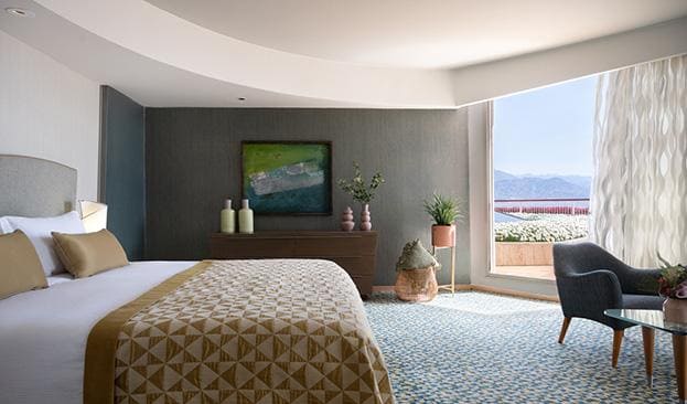 New Eilat Room (29 кв. м). Балкон или терраса, гостиная зона, спальня с двуспальной кроватью, ванная комната. Вид на залив.