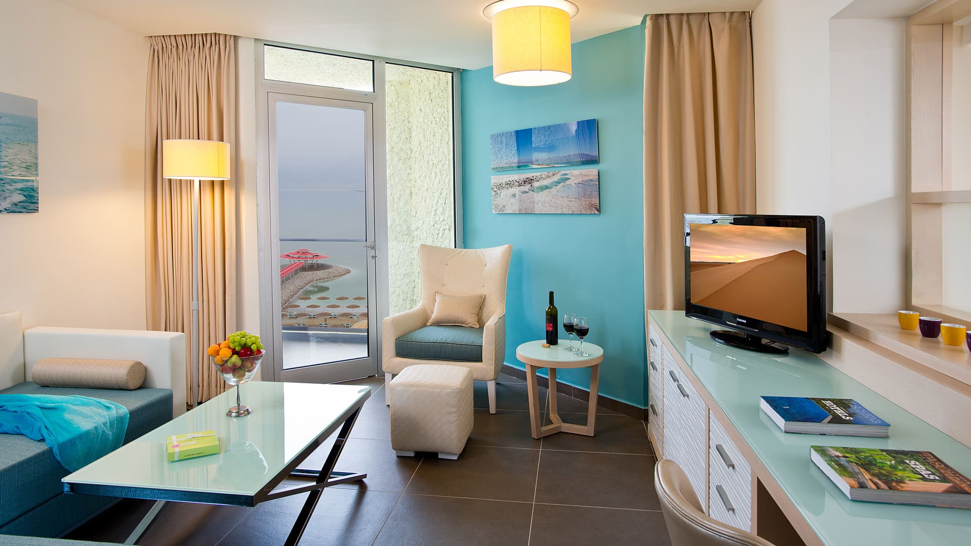 Отель расположен на собственном пляже Мёртвого моря, напротив гор Эдома.