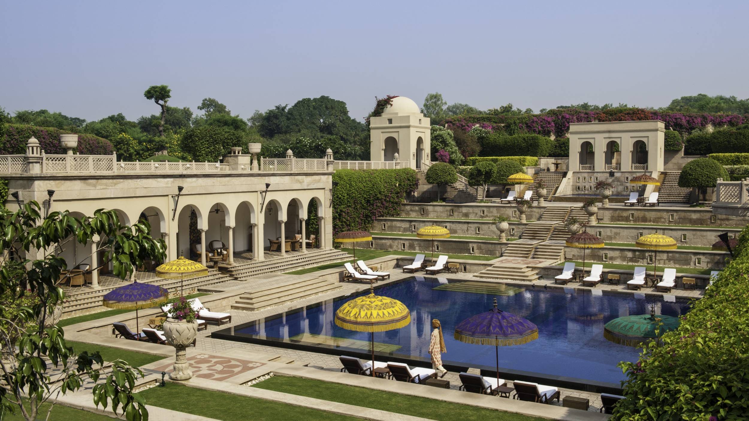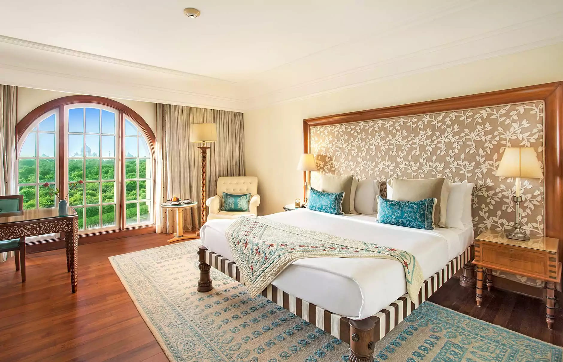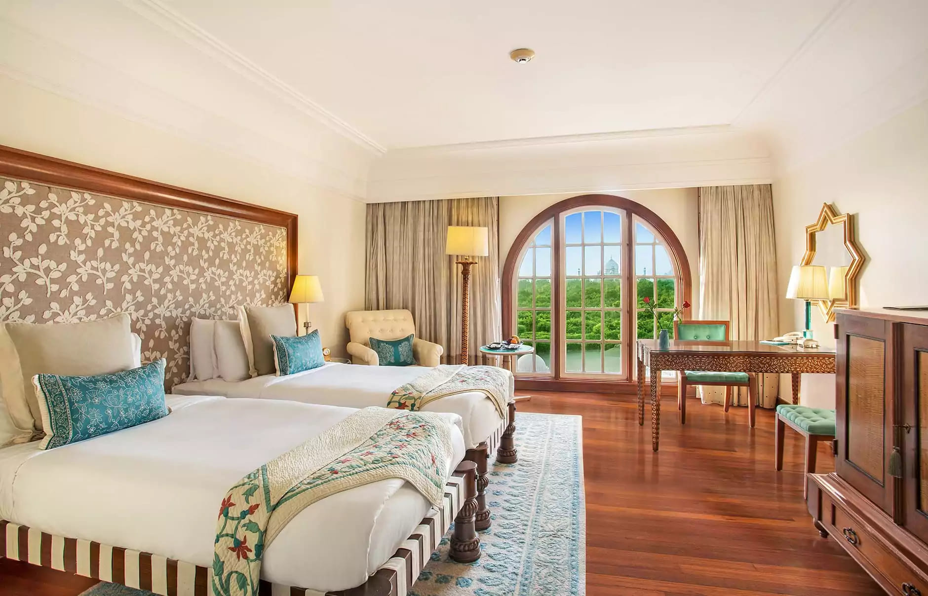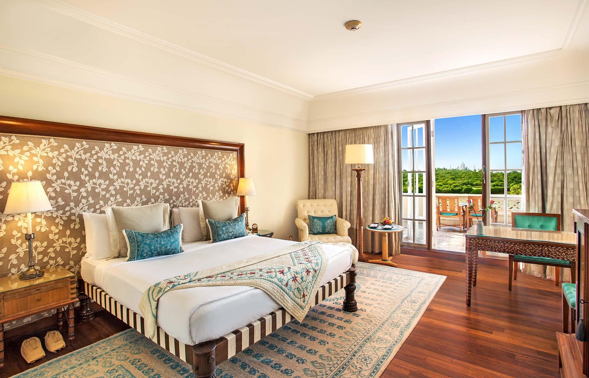 Luxury suite (175 кв.м) два номера – The Robert Burns suite и The B.K. Nehru suite: расположены на последнем – 5-м этаже отеля. В номере: прихожая, гостиная с обеденным столом на 6-8 персон и террасой с видом на Тадж Махал), спальня с гардеробной, ванная комната с угловой террасой с видом на Тадж Махал (на террасе - шезлонги). Номер может быть объединен с Deluxe Room. Дополнительные услуги: бутылка шампанского и розы при приезде, большая корзина лучших тропических фруктов, факс.