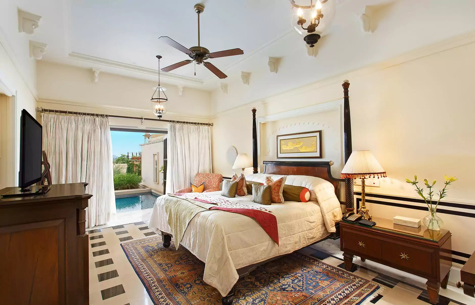 Luxury suite: 10-метровый частный бассейн с видом на озеро и дворцы, открытый обеденный павильон, гостиная, спальня, ванная комната.