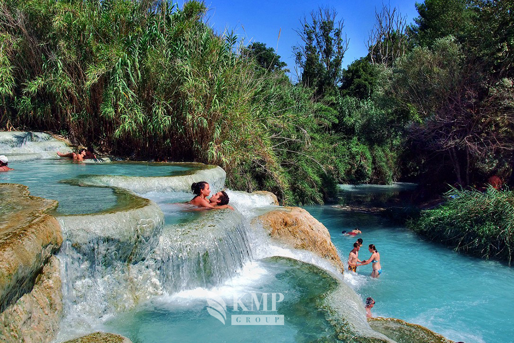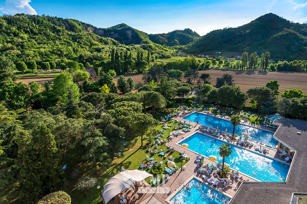 Термальная вода Эуганского бассейна берёт своё начало в районе Малых Доломитов и Лессинских гор. Дождевая вода, проникая в горные породы вулканического происхождения, достигает глубины 2000 - 3000 метров. Оттуда она проделывает путь длиной в приблизительно 80 км за 25 - 30 лет, обогащаясь минеральными солями, достигая зоны Эуганских Холмов. Здесь она выходит на поверхность при температуре, колеблющейся от 83°C до 87°C, образуя небольшие озёра. Неоднократные химические анализы воды подтвердили постоянство её состава, классифицировав как минеральную соле-бромо-иодистую воду, с характерным присутствием натрия, брома и йода. Термальная вода находит своё преобладающее применение в термальных бассейнах и терапевтической реабилитации. Термальная грязь подвергается "созреванию", консервации и регенерации.