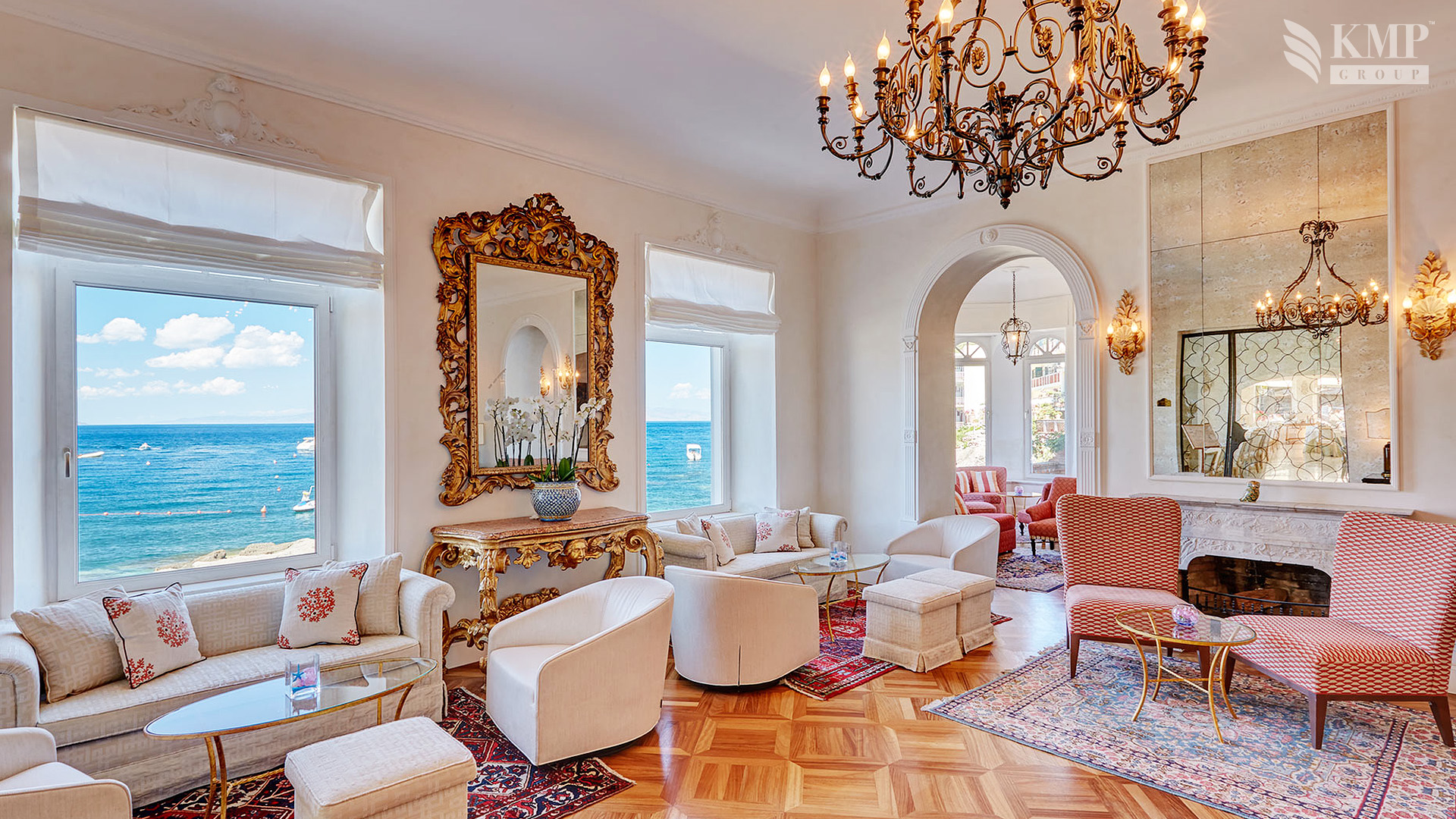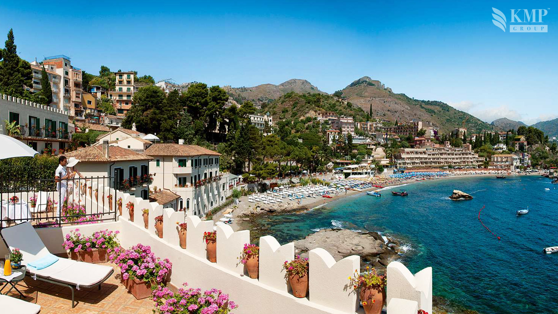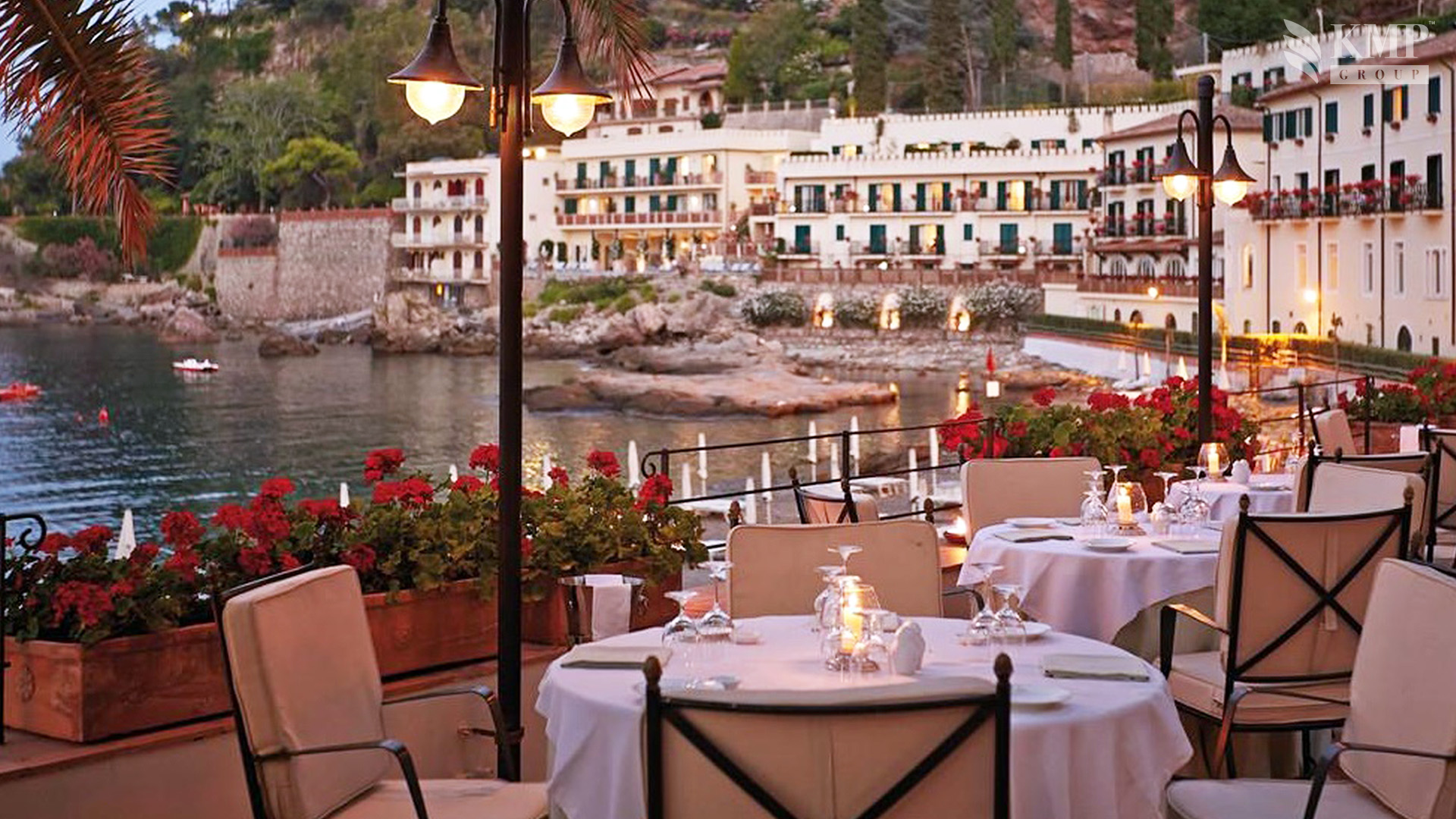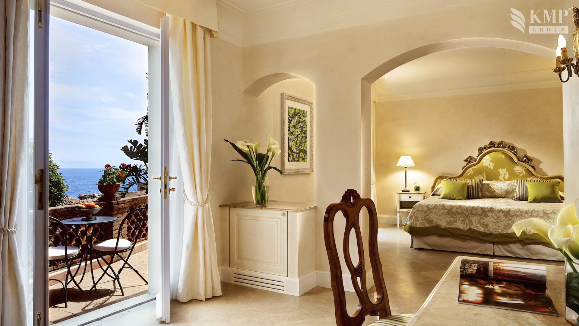 Mazzaro suite. Терраса, спальня с гостиной зоной, ванная комната с ванной и душевой. Вид на залив.