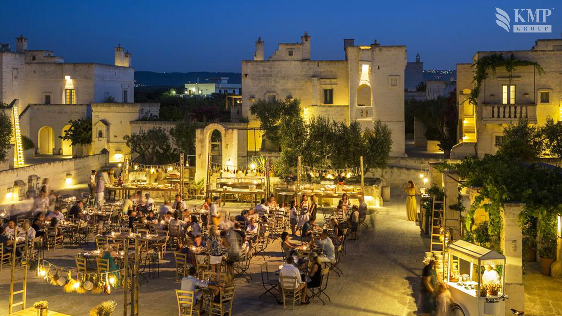 La Corte Magnifica room (60-75 кв. м). Терраса, гостиная с обеденной зоной, спальня с кроватью king-size, ванная комната с ванной и душевой. Вид на бассейн и оливковую рощу или гольф-поле и море.