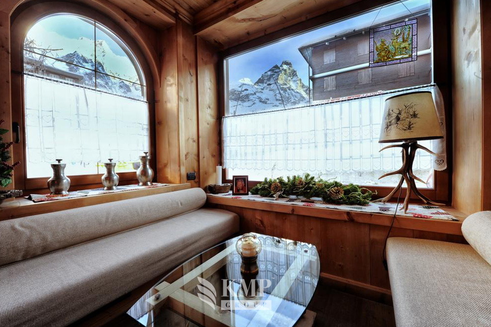 Junior Suite Matterhorn (25-27 кв. м). Комфортабельные и просторные номера, выходящие на север, позволяют насладиться прекрасным видом на заснеженную Гору Червино и лыжные склоны. Состоят из спальни, гостиной зоной с диваном-кроватью и большой ванной комнатой. Интерьер в традиционном стиле и деревянная обшивка стен позволяют создать уютную атмосферу, идеально подходящую для спокойного отдыха в горах.