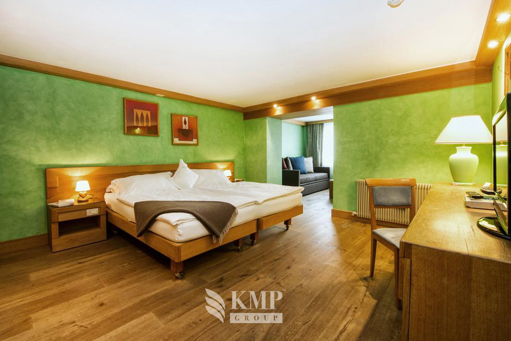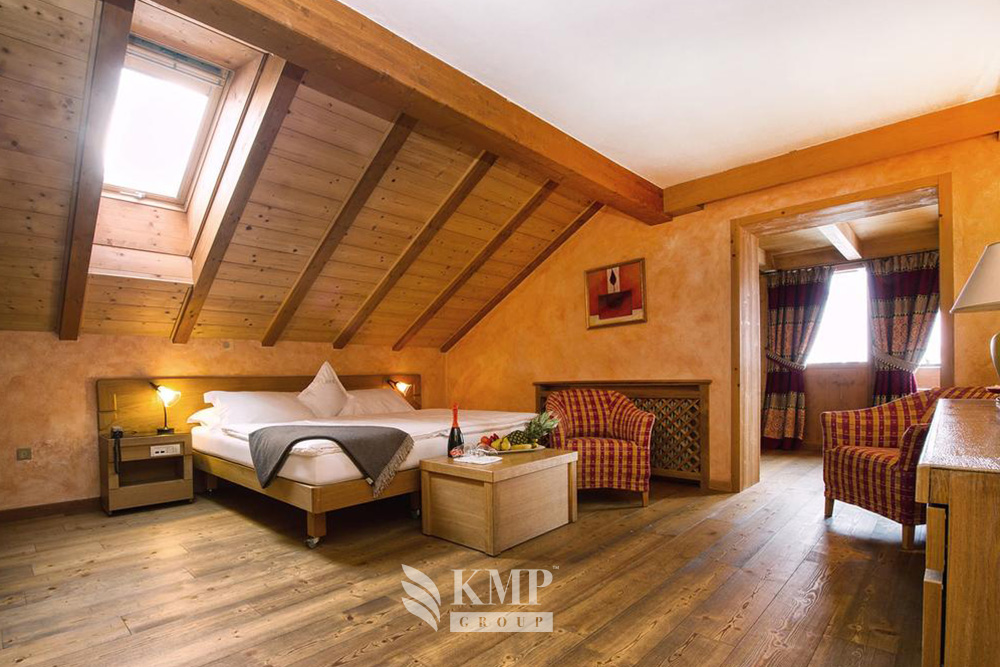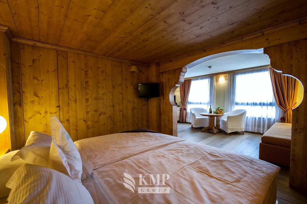 Junior Suite Sunny Side (25-27 кв. м). Комфортабельные, просторные и очень светлые номера, выходящие на юг располагают основной спальней,гостиной с диваном-кроватью и большой ванной комнатой. Интерьер в традиционном стиле, деревянный паркет и деревянная обшивка стен помогают создать уютную атмосферу, идеально подходящую для спокойного отдыха в горах.