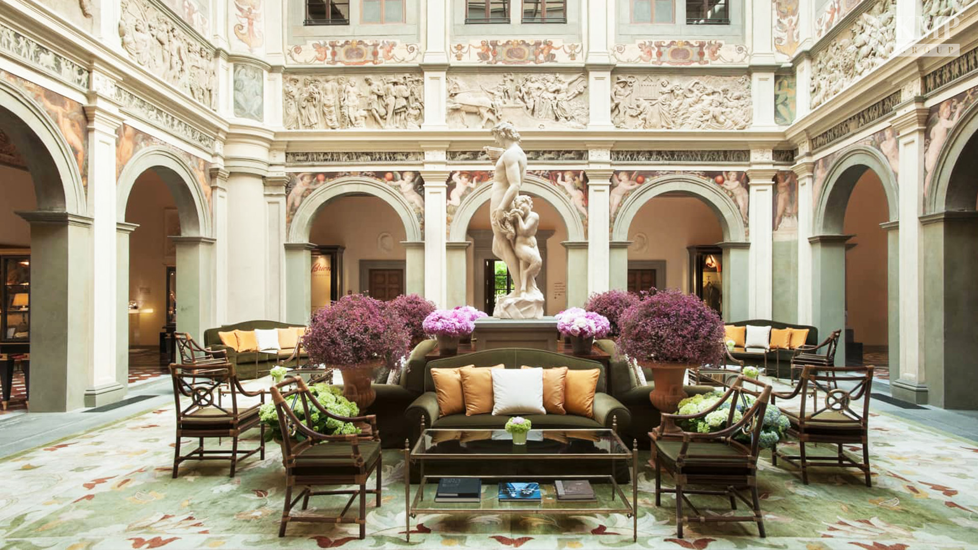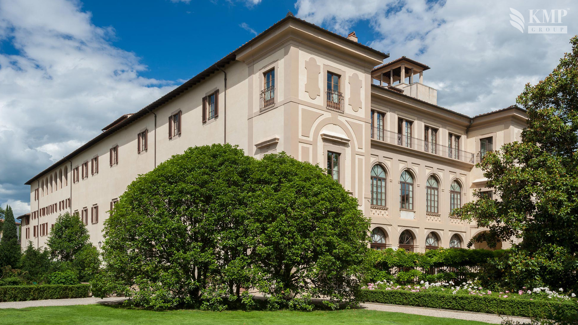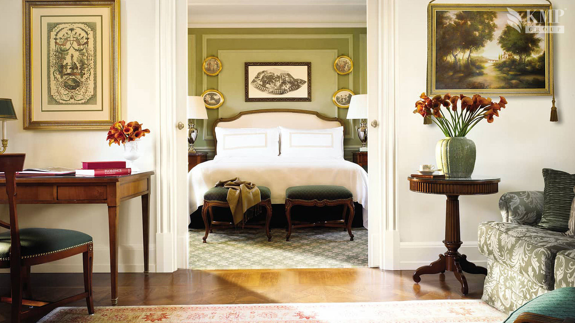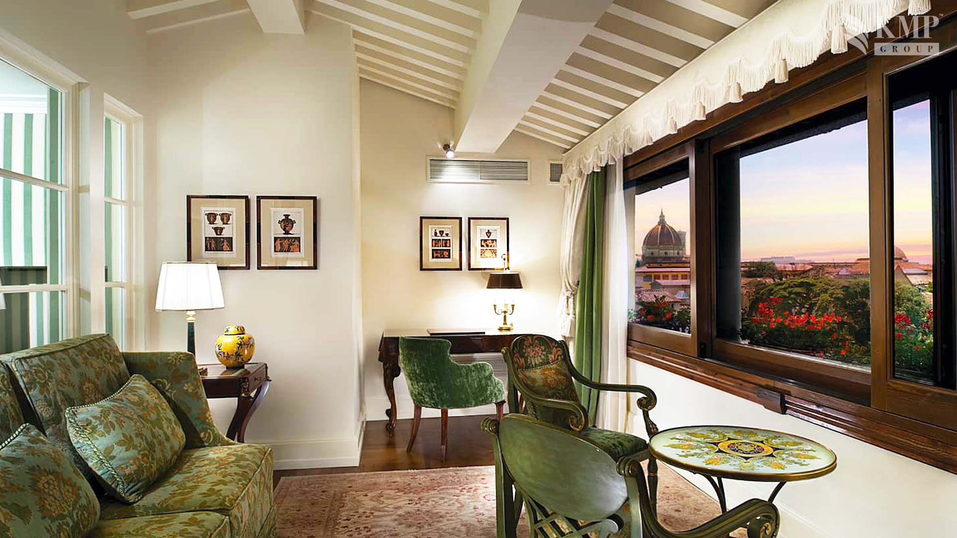 Presidential suite De Medici (205 кв. м). Балкон, гостиная с обеденной зоной, спальня с кроватью king-size, ванная комната, гостевой санузел. Вид на парк.