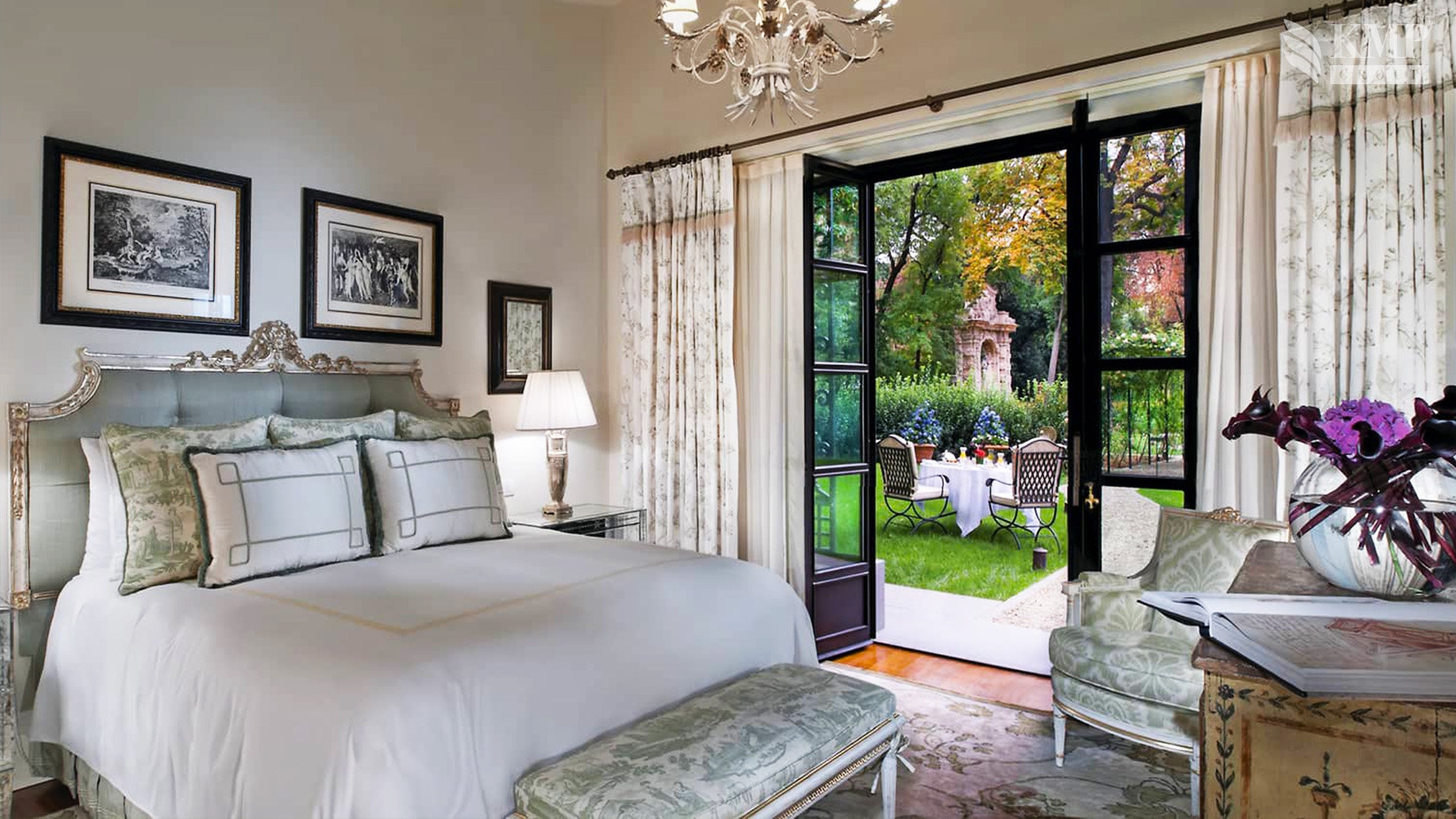 Frescoed executive suite (90 кв. м). Гостиная, спальня с кроватью king-size, ванная комната, гостевой санузел. Вид на сад.