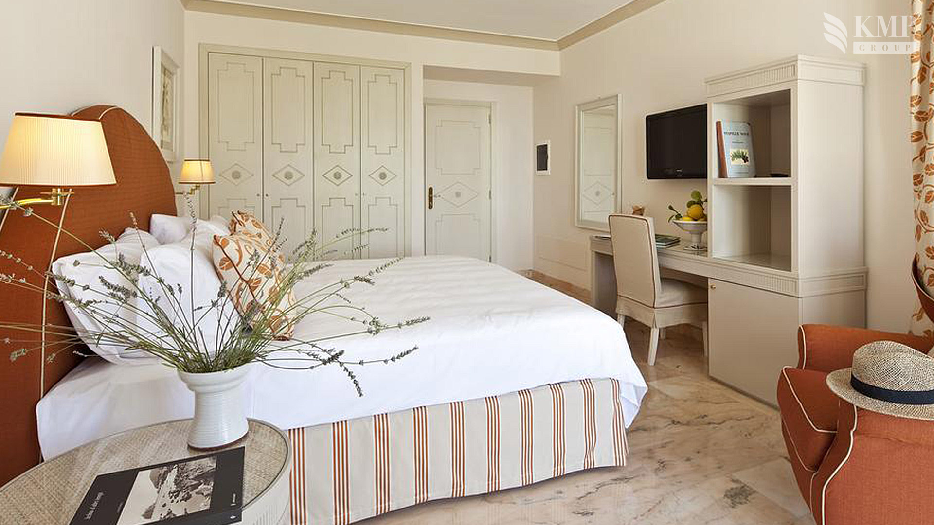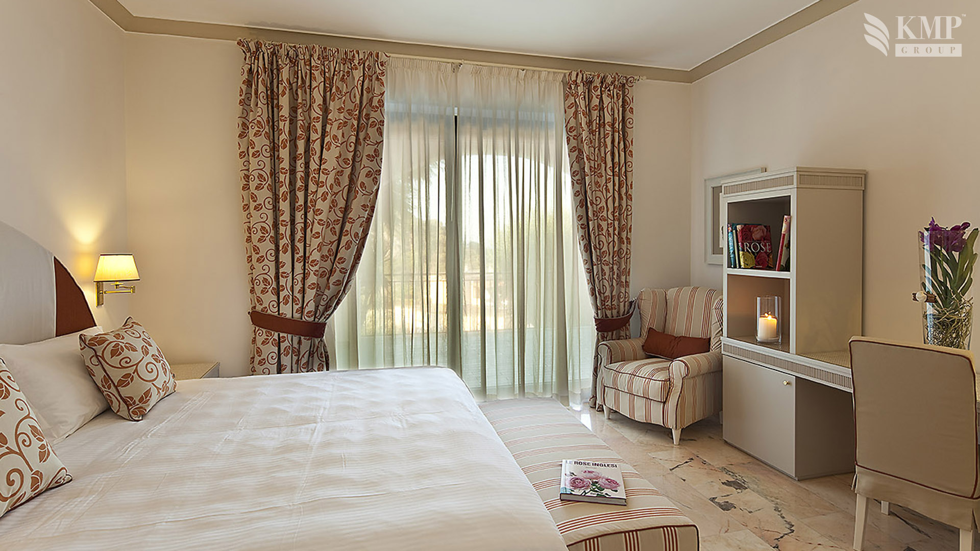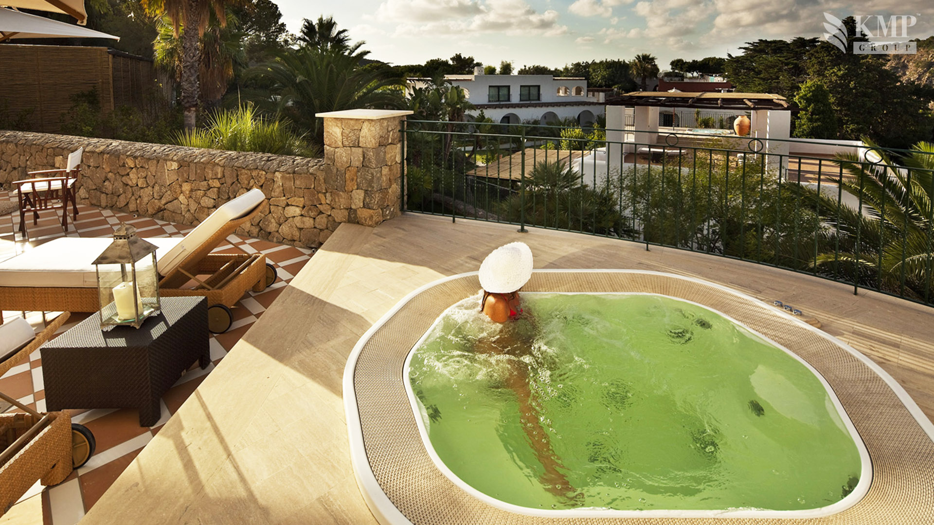 Junior Suite (42 кв. м).Терраса с джакузи, гостиная, спальня, ванная комната. Вид на сад.
