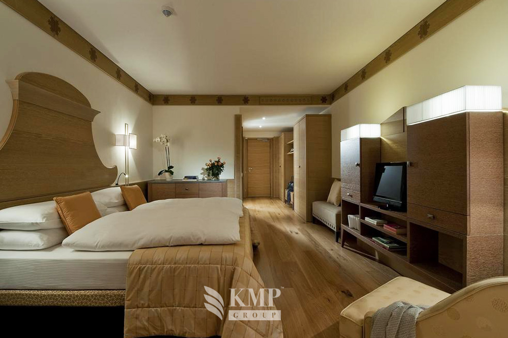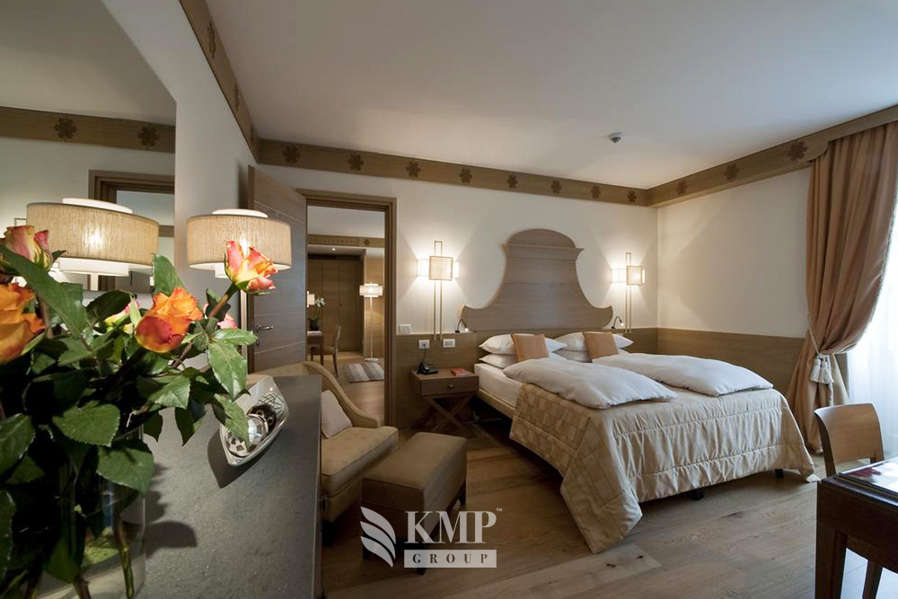 Suite (60–70 кв. м). Гостиная зона, спальня с кроватью king-size или двумя отдельными кроватями, ванная комната с ванной или с ванной и душевой кабиной. Есть номера с гардеробной. Некоторые номера имеют балкон или террасу с видом на горы.
