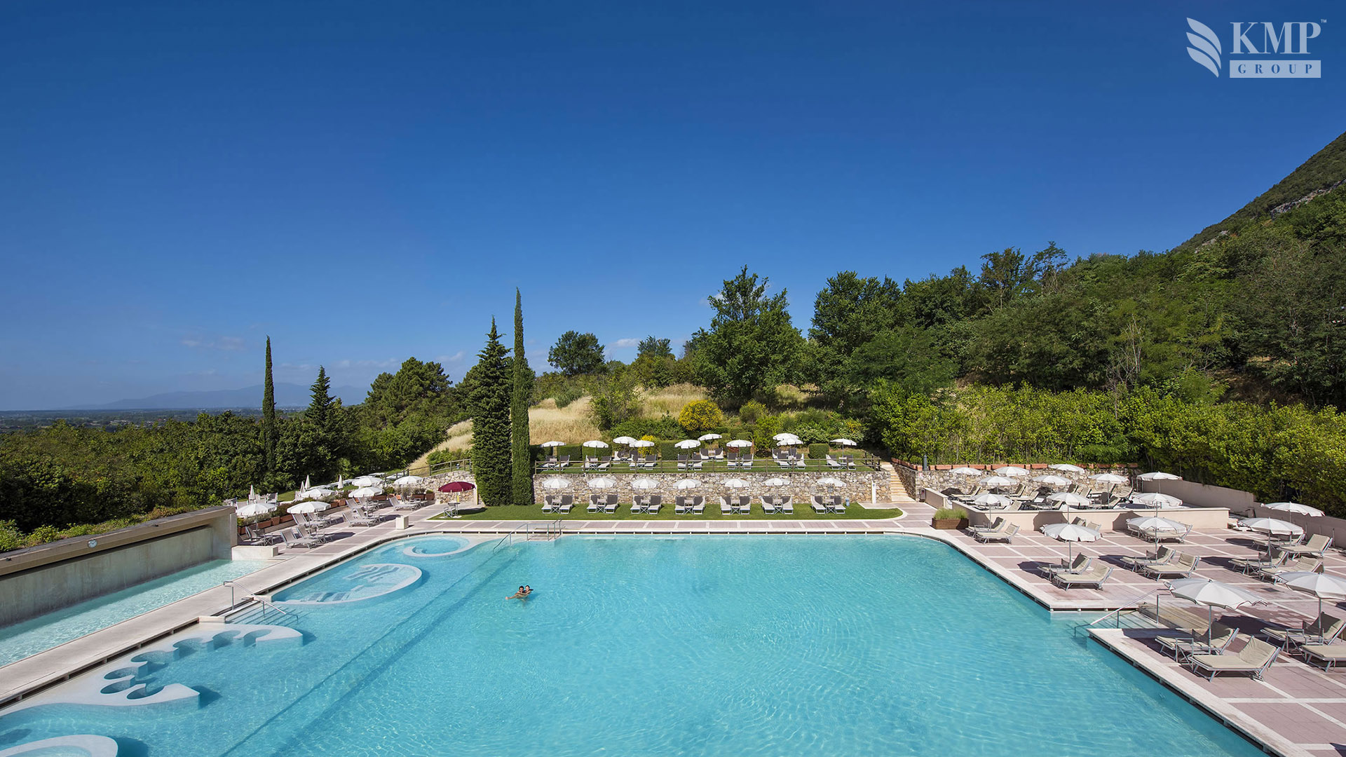 Junior suite mountain view (40 кв. м). Спальня с гостиной зоной (кровать queen-size), ванная комната с ванной и душевой кабиной. Расположены в современной части здания. Вид на гору Monsummano.