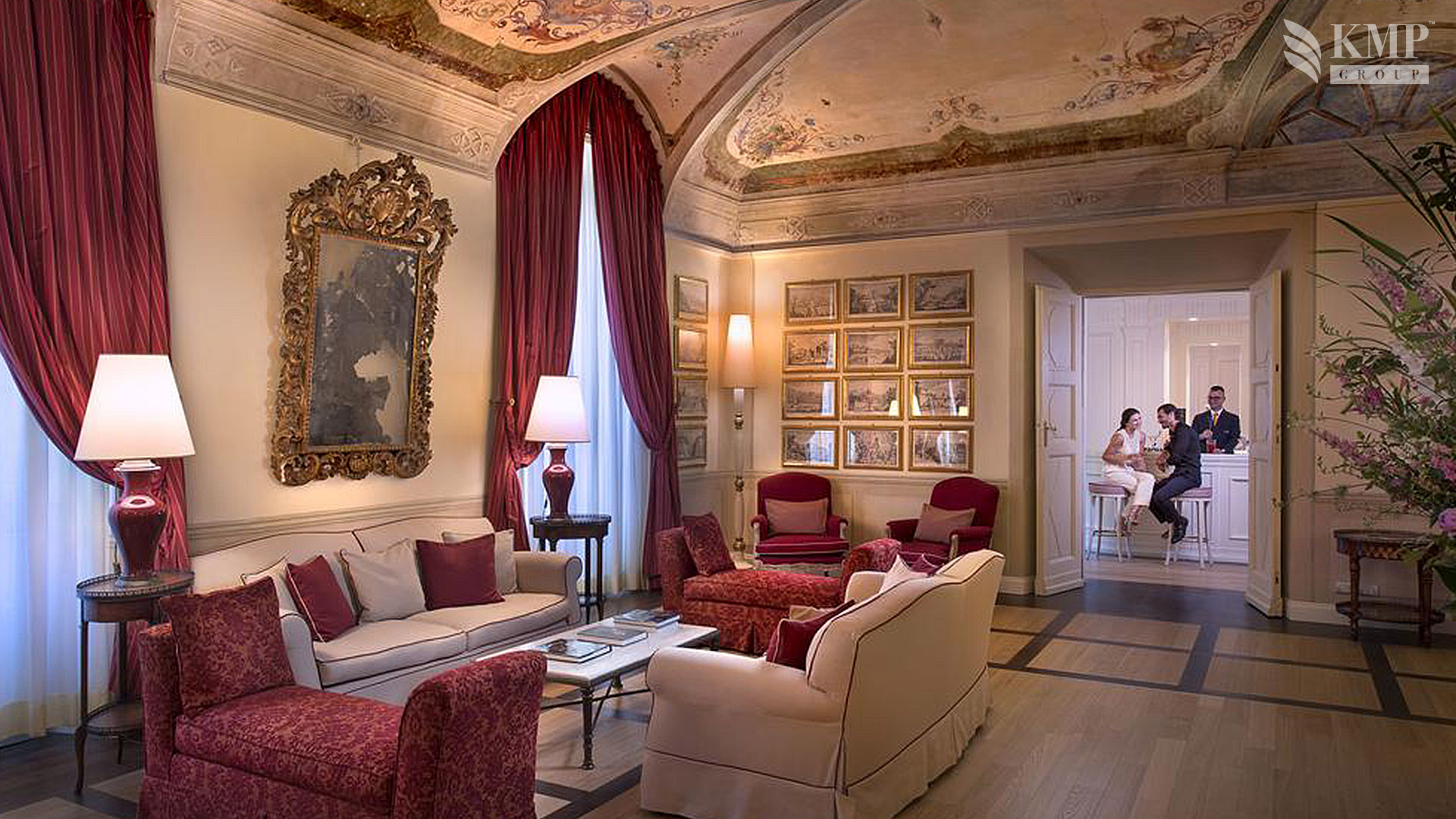 Junior suite park view (44 кв. м). Балкон, спальня с гостиной зоной (кровать queen-size), гардеробная, ванная комната с ванной и душевой кабиной. Расположены в современной части здания. Вид на парк.