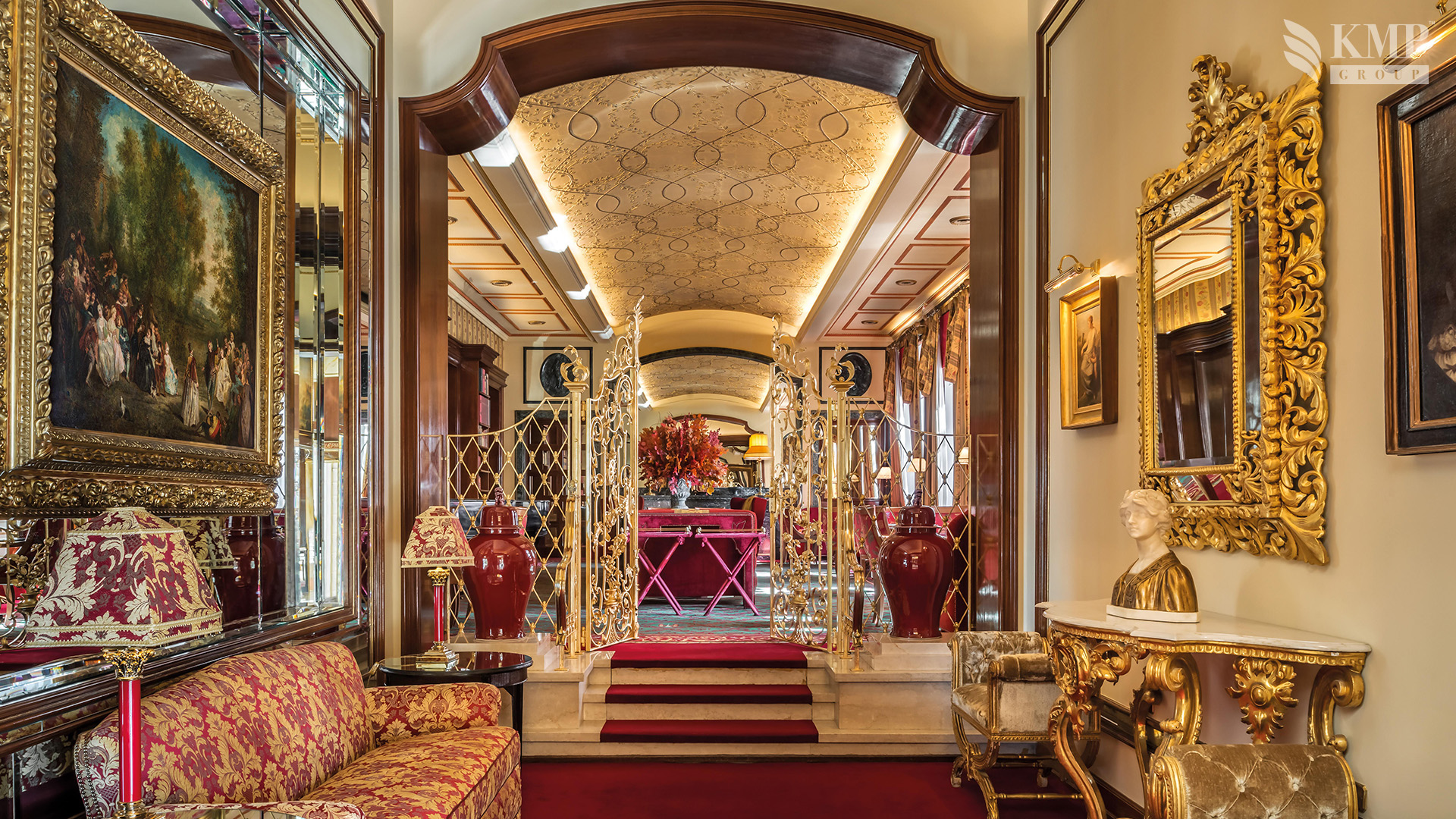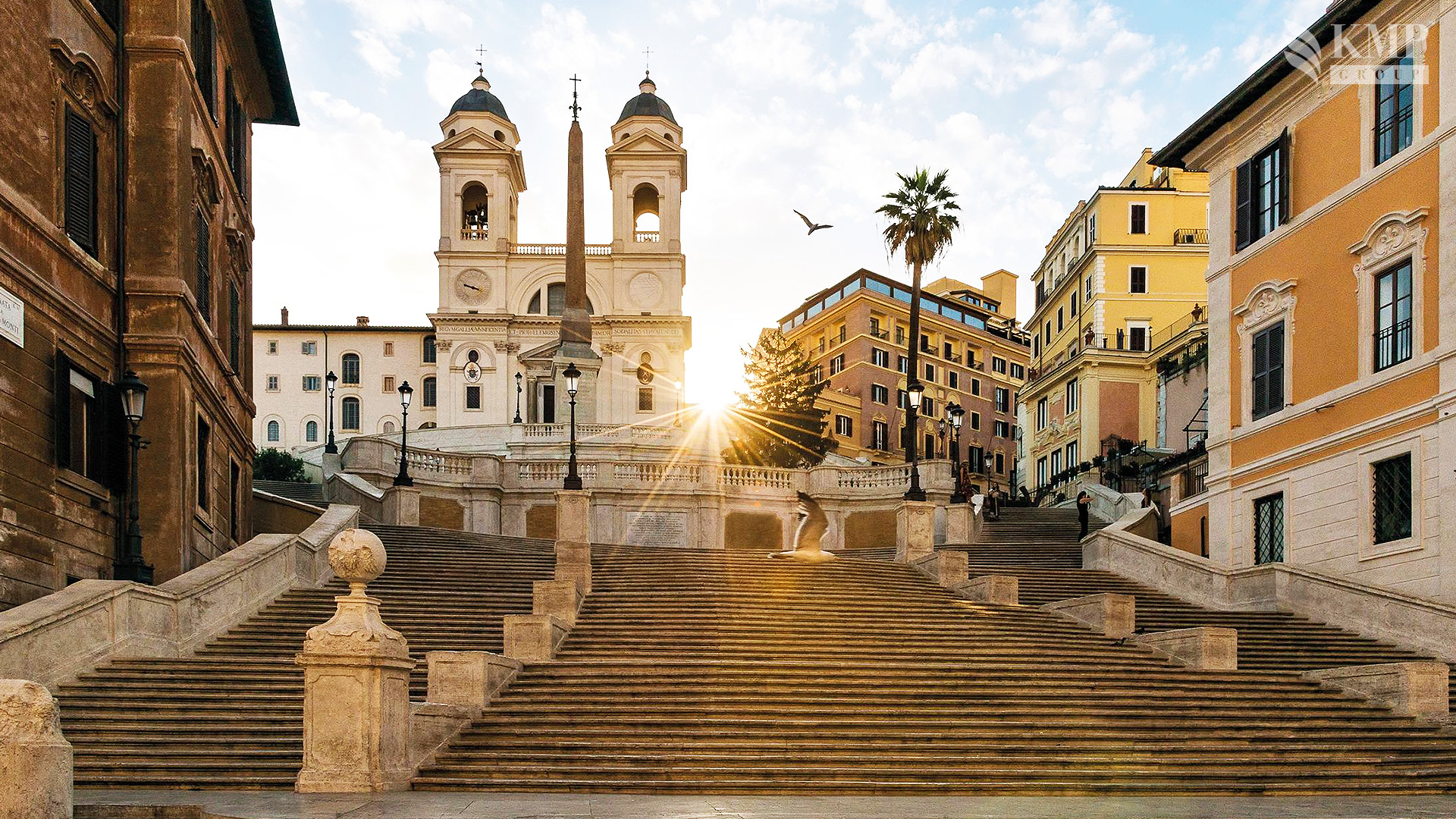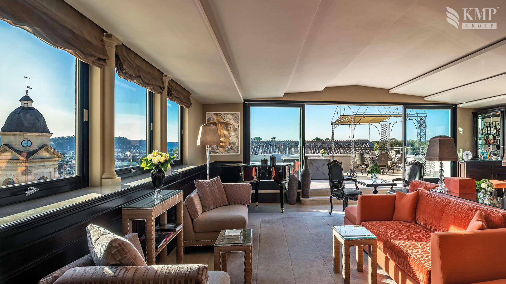 Grand deluxe suite Hassler (75 кв. м). Гостиная, спальня, ванная комната с джакузи и душевой. Вид на Испанскую лестницу и церковь Trinita Dei Monte.