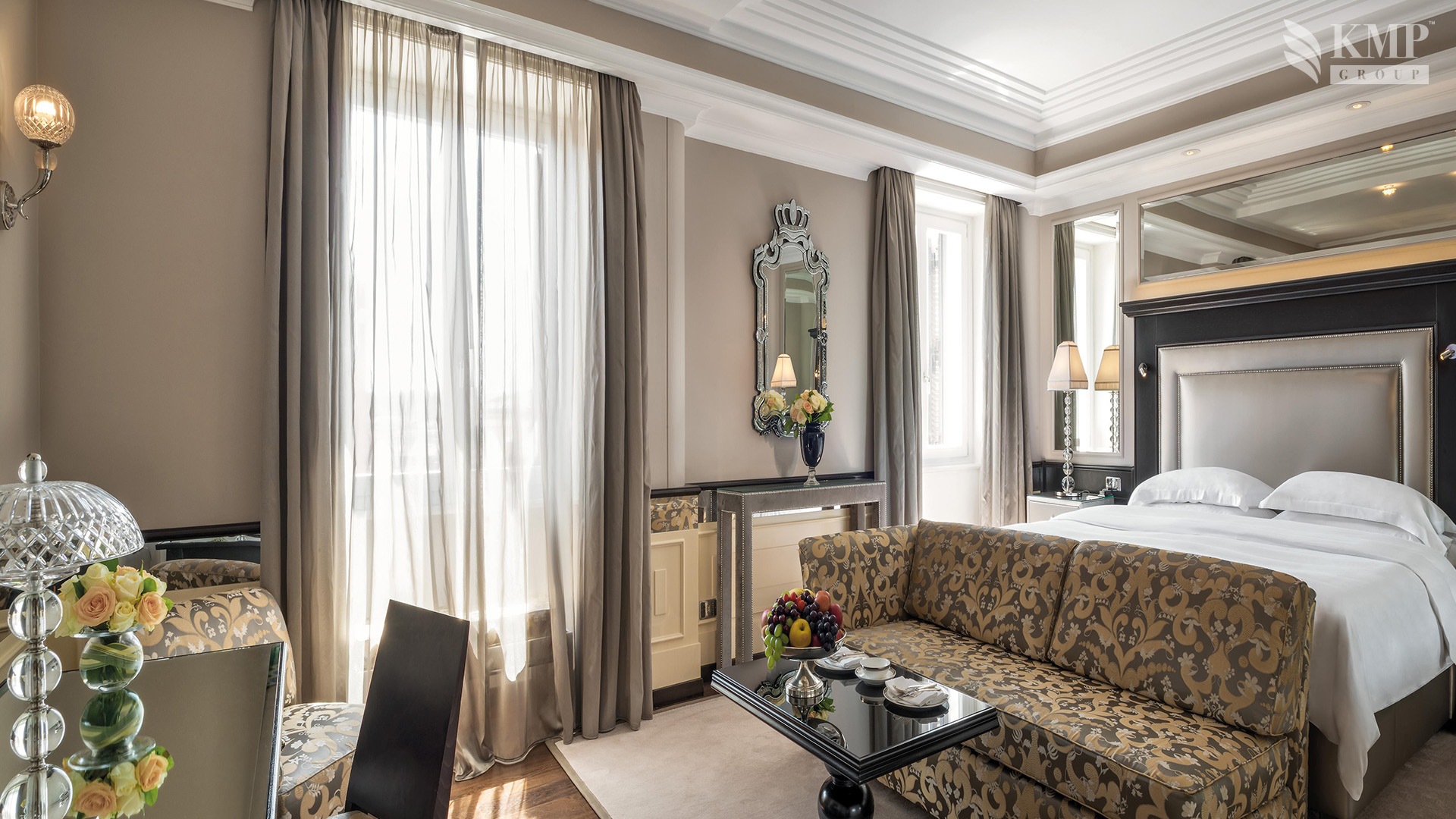 Grand deluxe room (35 кв. м). Балкон (в некоторых номерах), спальня с гостиной зоной (в некоторых номерах – отдельная гостиная), гардеробная (в некоторых номерах), ванная комната с ванной или ванной и душевой. Вид на город, внутренний дворик или сад.
