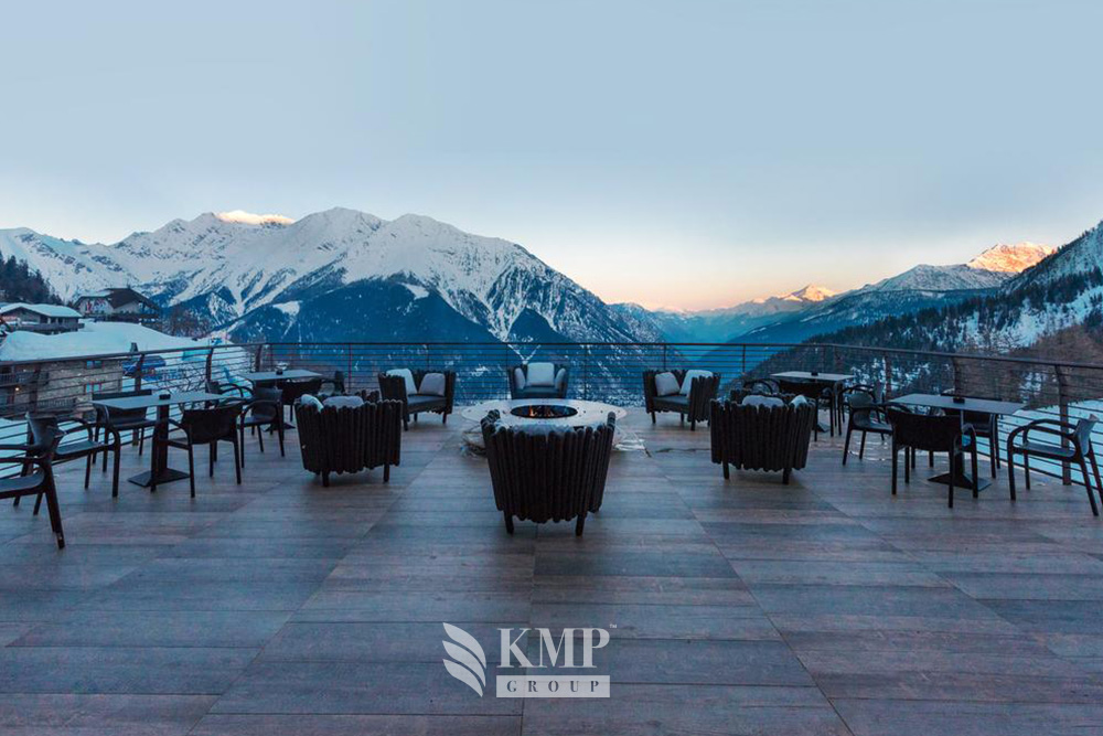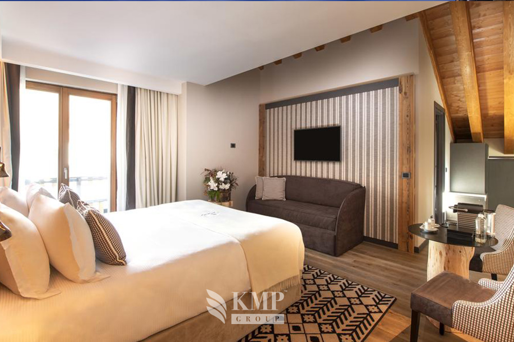 Roof top suite (45-48 кв. м). Терраса, спальня с гостиной зоной, ванная комната. Расположены на верхних этажах. Мансардные потолки. Вид на горы.
