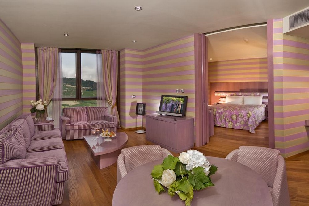 Platinum Suite: просторный номер с гостиной, спальней, ванной комнатой с джакузи и террасой с захватывающим панорамным видом на холмы и виноградники.