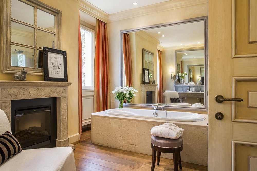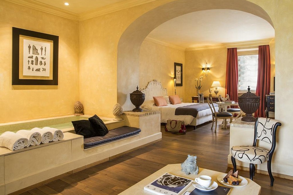 Suites: Шторы, покрывала, и постельное белье сделаны из лучших тканей – льна, тафты и атласа. Элегантные белые ванны стоят на старинном паркете из массива дуба, возле окна с видом на восхитительный пейзаж. В некоторых сьютах есть просторные душевые, размером до 3x2 метров, все напоминают римские спа.
