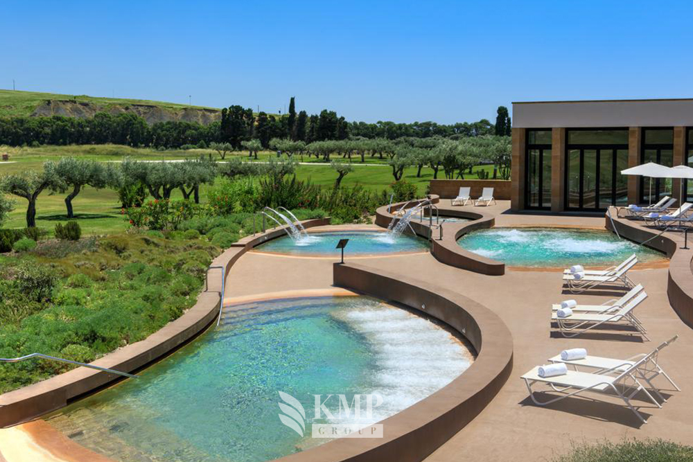 Villa Peonia (260 кв. м). Терраса с открытым персональным бассейном и обеденной зоной на открытом воздухе, гостиная с обеденной зоной, мини-кухня, 3 спальни (каждая – с гостиной зоной и кроватью king-size), гардеробные зоны, 3 ванные комнаты (каждая – с ванной и душевой кабиной), гостевой туалет. Дополнительно: кофемашина. Вид на море и гольф-поля.