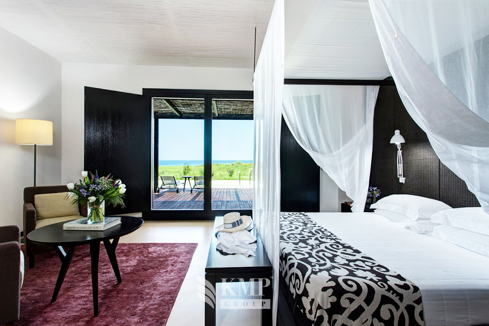 Classic suite (60 кв. м). Терраса с выходом в сад, гостиная зона, спальня с кроватью king-size, ванная комната с ванной и душевой кабиной. Расположены на нижнем этаже рядом с морем. Вид на море и на поле для гольфа.