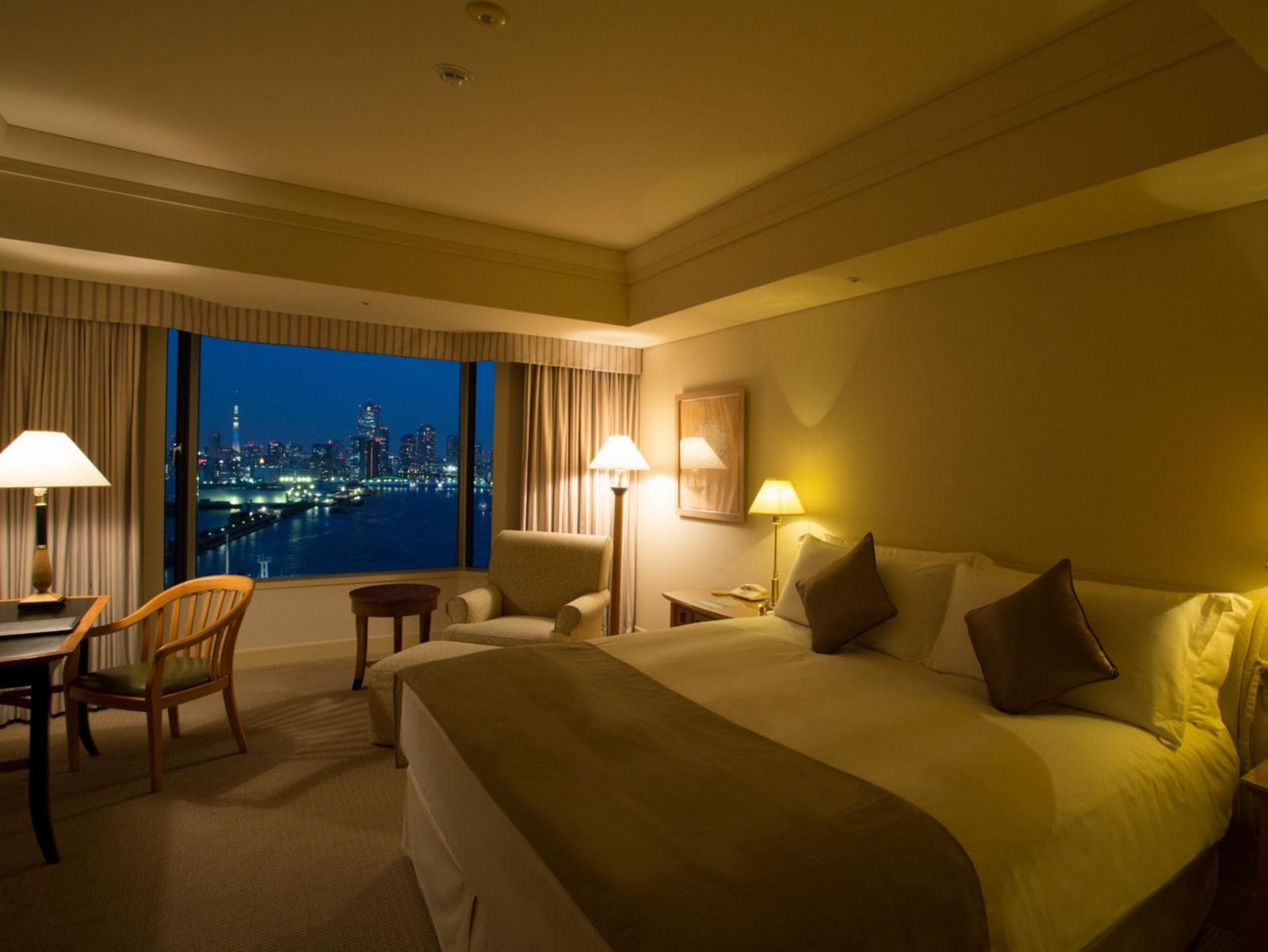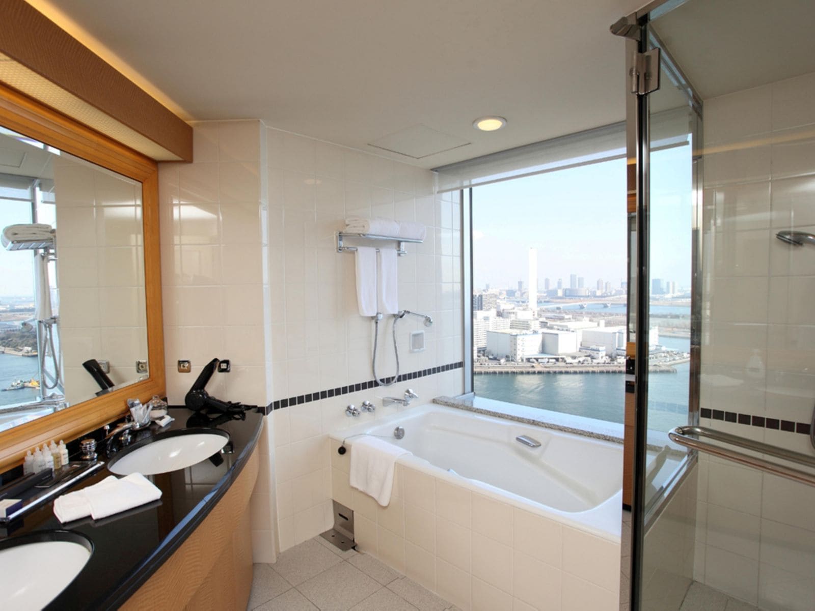Premium Bay View Room (38-52 кв. м). Гостевая зона, просторная спальня с большой двуспальной кроватью или двумя отдельными кроватями, ванная комната с душевой и отдельно стоящей ванной, рядом с которой расположено окно, откуда можно любоваться панорамами Токио. Вид на Токийский залив.