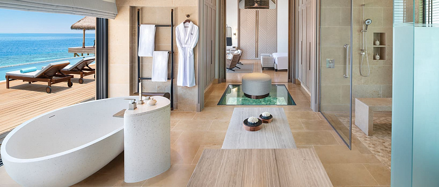 Reef villa with pool (279-286 кв. м). Терраса с открытым персональным бассейном (12х4 м) и обеденной зоной на открытом воздухе, спальня с гостиной зоной (кровать king-size или две отдельные кровати), ванная комната с ванной, душевой кабиной и душем на открытом воздухе. Расположены частично на берегу, частично на сваях над водой.