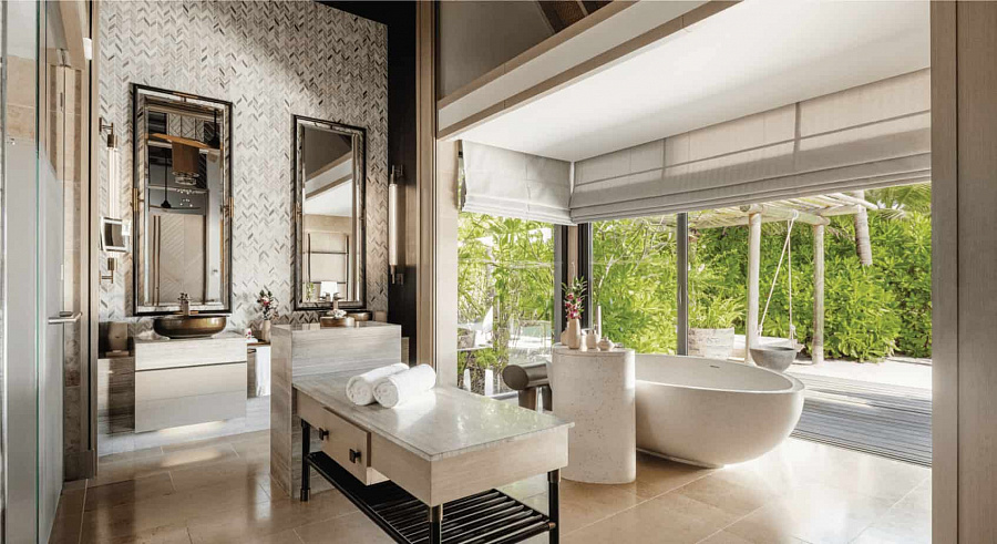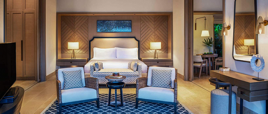 3-bedroom grand beach villa with pool (1023 кв. м). Двухуровневая терраса с 2 открытыми персональными бассейнами и обеденной зоной на открытом воздухе, гостиная с обеденной зоной, мини-кухня, 3 спальни (каждая – с кроватью king-size), 3 ванные комнаты, комната для прислуги.