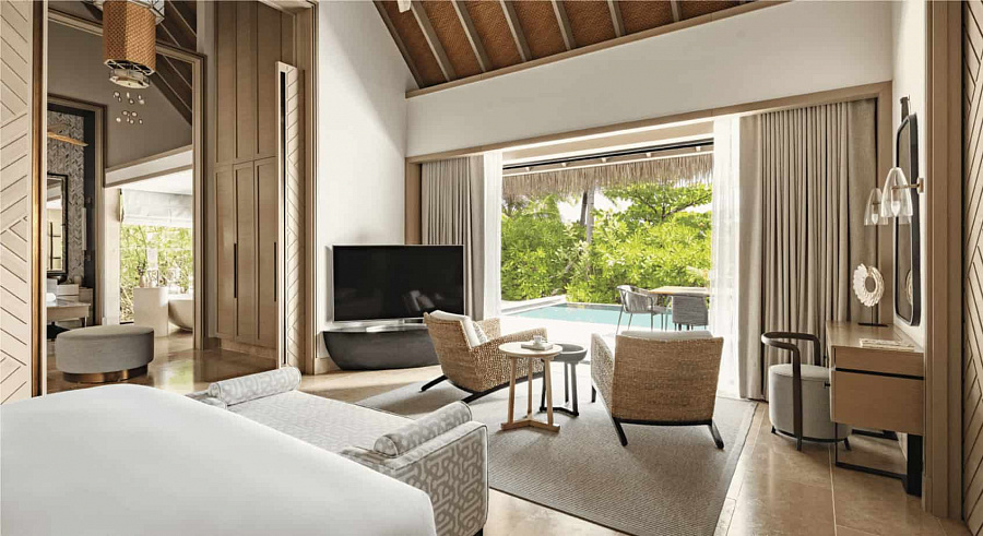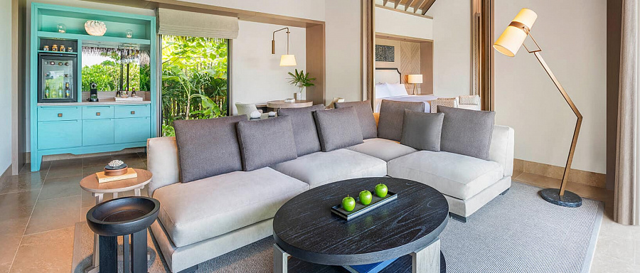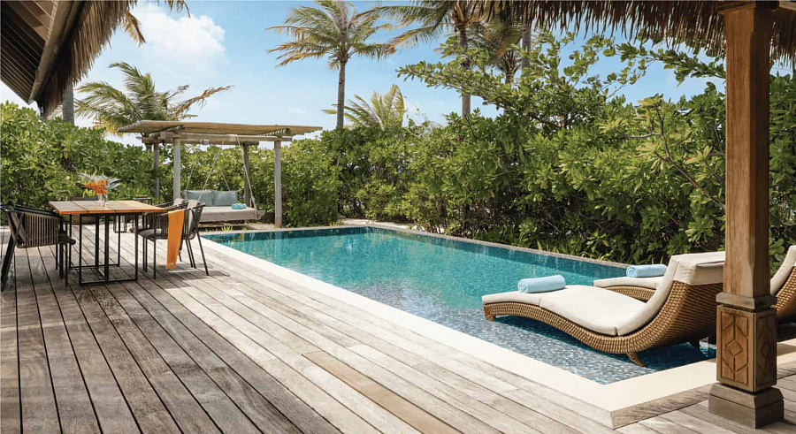 2-bedroom beach villa with pool (599 кв. м). Терраса с открытым персональным бассейном (15х4 м) и обеденной зоной на открытом воздухе, гостиная с обеденной зоной, 2 спальни (одна – с кроватью king-size, другая – с двумя отдельными кроватями), 2 ванные комнаты. Расположены рядом с пляжем. Прямой выход к пляжу.