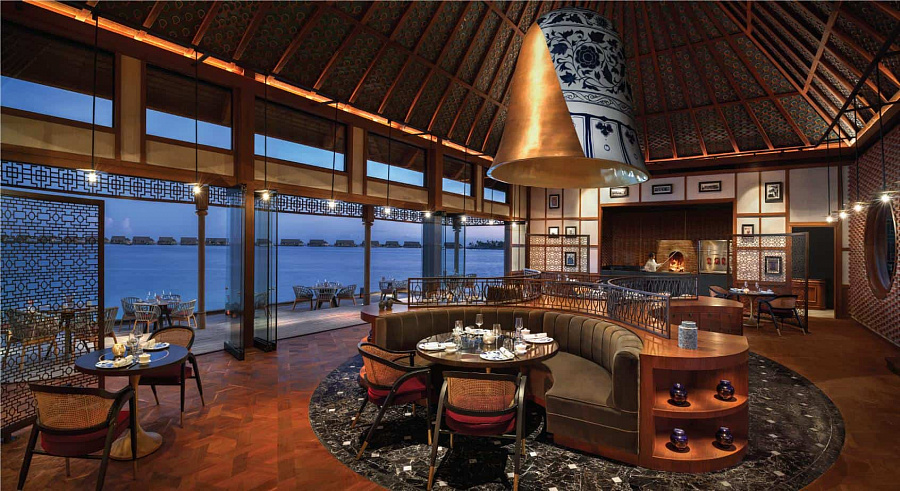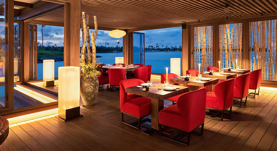 3-bedroom overwater villa with pool (1113 кв. м). Терраса с 2 открытыми персональными бассейнами и обеденной зоной на открытом воздухе, гостиная с обеденной зоной, мини-кухня, 3 спальни (две – с кроватью king-size, одна – с двумя отдельными кроватями), 3 ванные комнаты. Расположены на сваях над водой. Вид на закат.