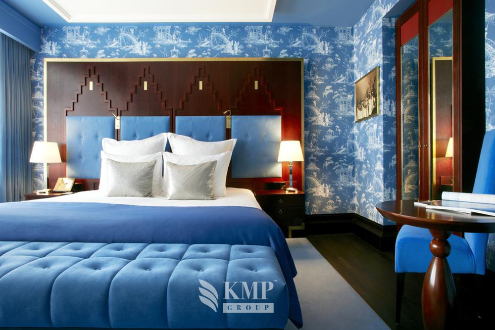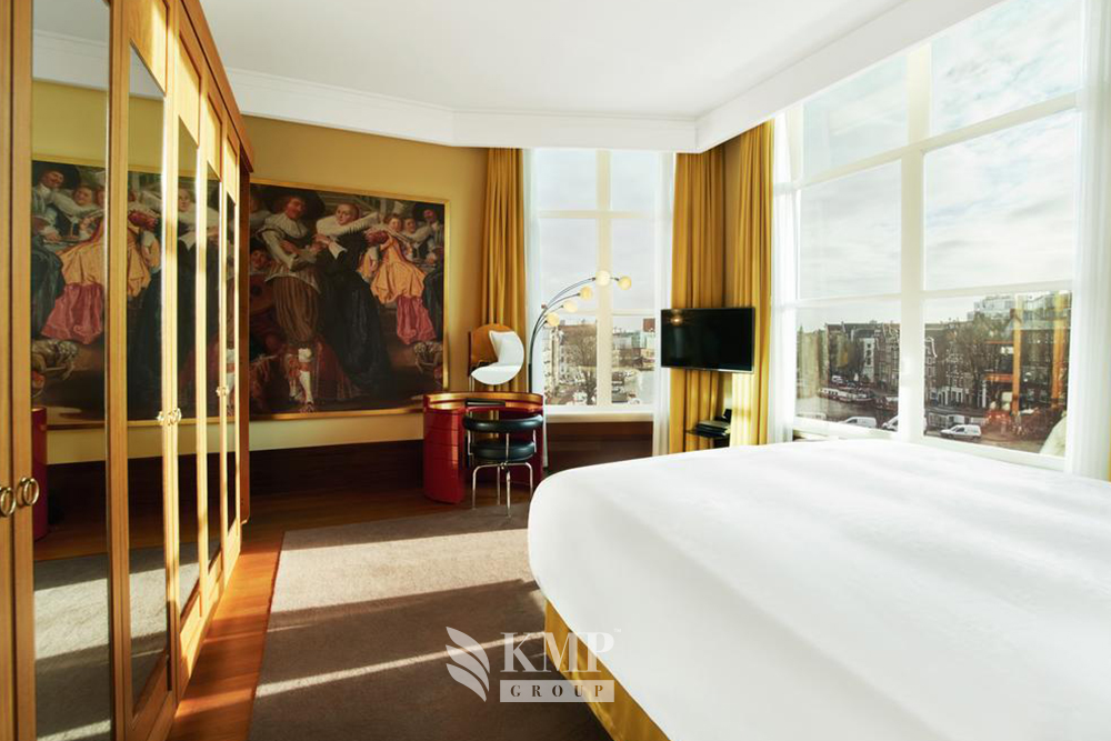 Provocateur suite (82 кв. м). Спальня, ванная комната. Расположен в крыле Dutch master wing. Вид на реку и город.