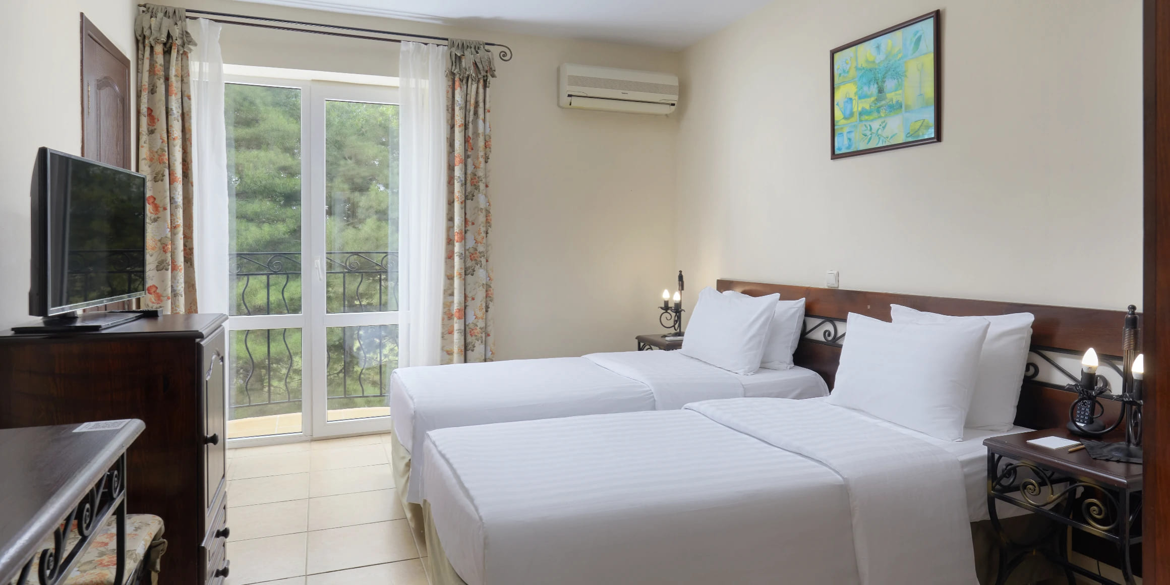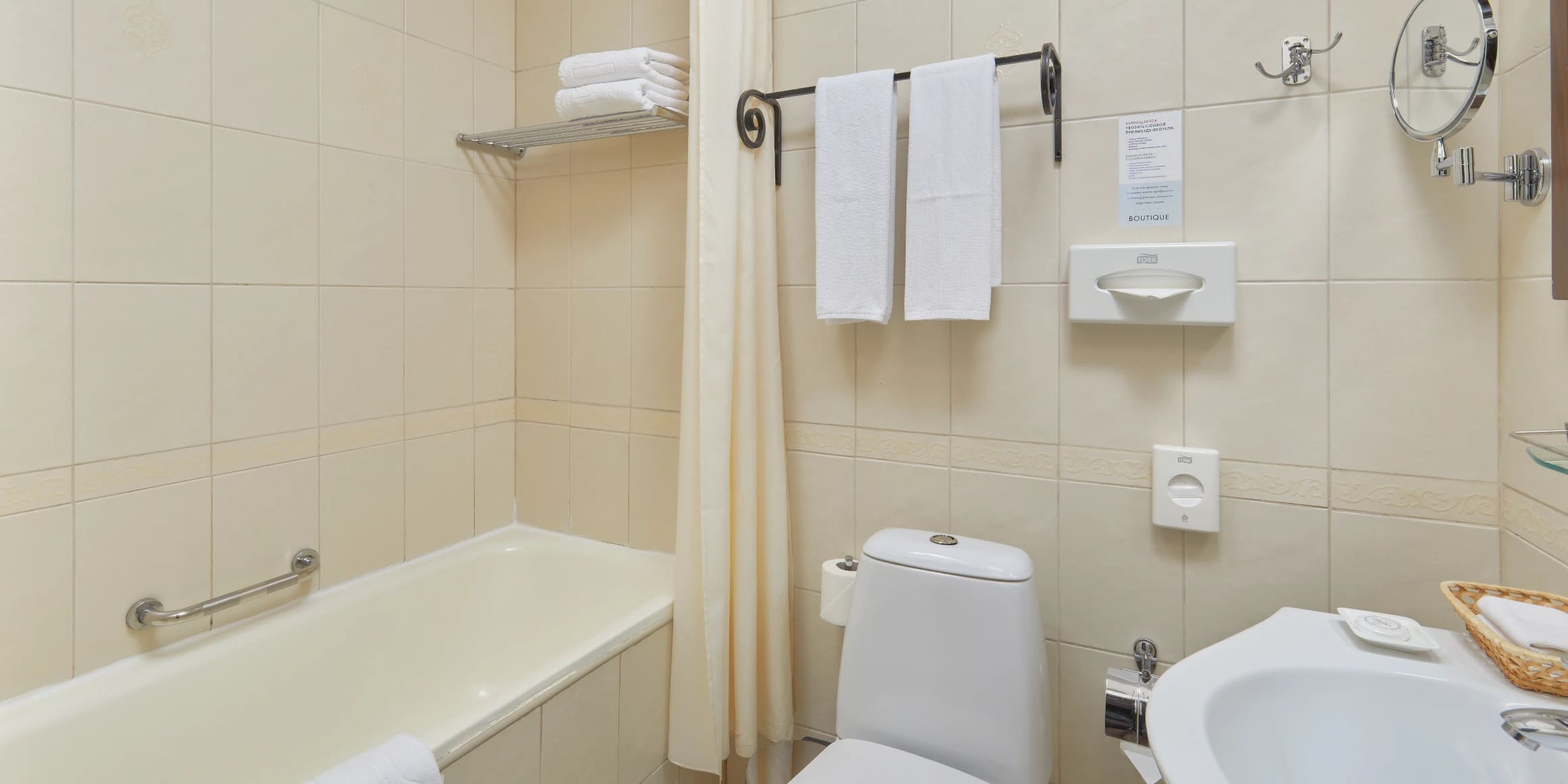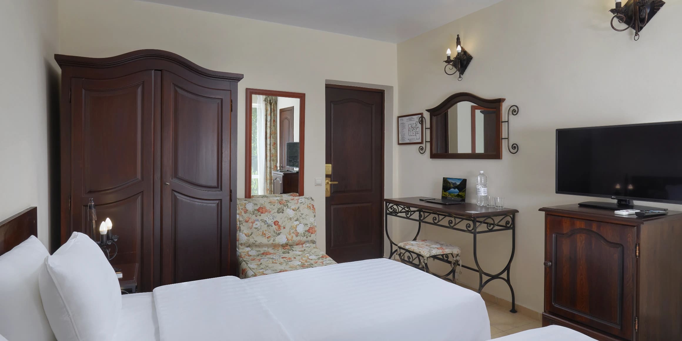 Стандарт 2-местный 1-комнатный 12-20 кв.м (1 доп. место). Балкон или дворик оборудован мебелью и сушилкой. Мебель: две односпальные кровати/одна двуспальная кровать, зеркало, прикроватные тумбочки, пуфик, стулья, туалетный столик, шкаф, мини-холодильник, сплит-система, телевизор, телефон. Санузел: с ванной, таз, тапочки, туалетные принадлежности: фен, халат.