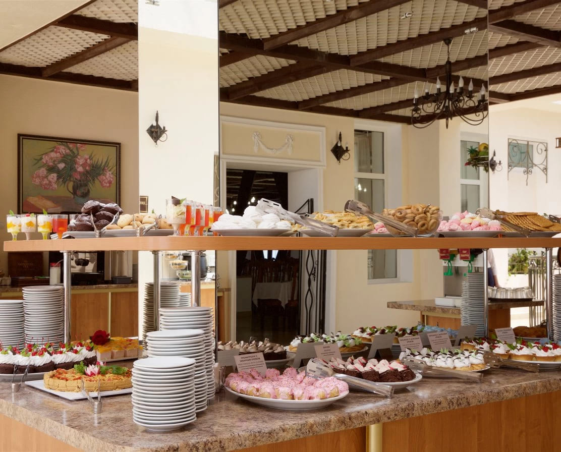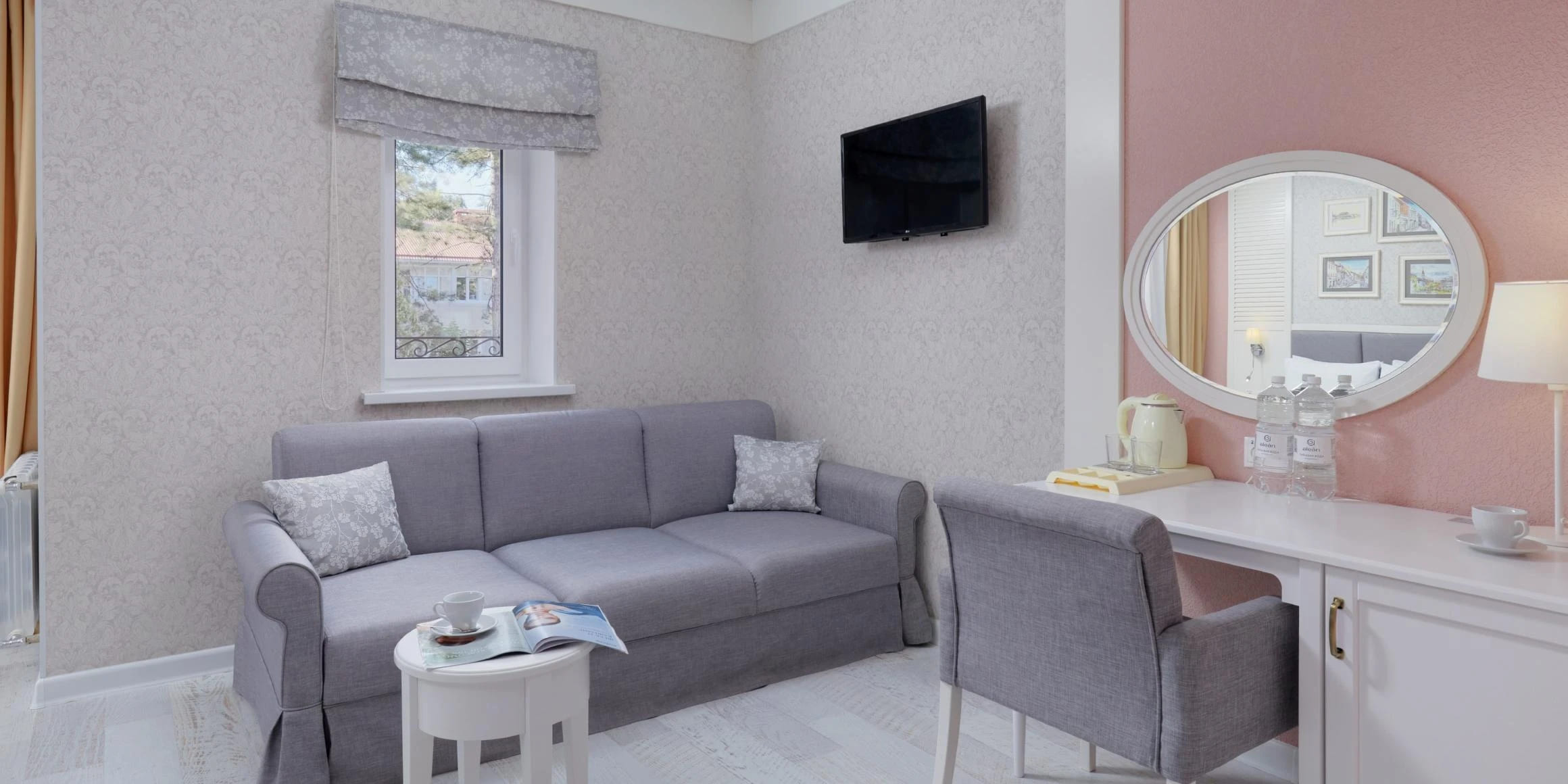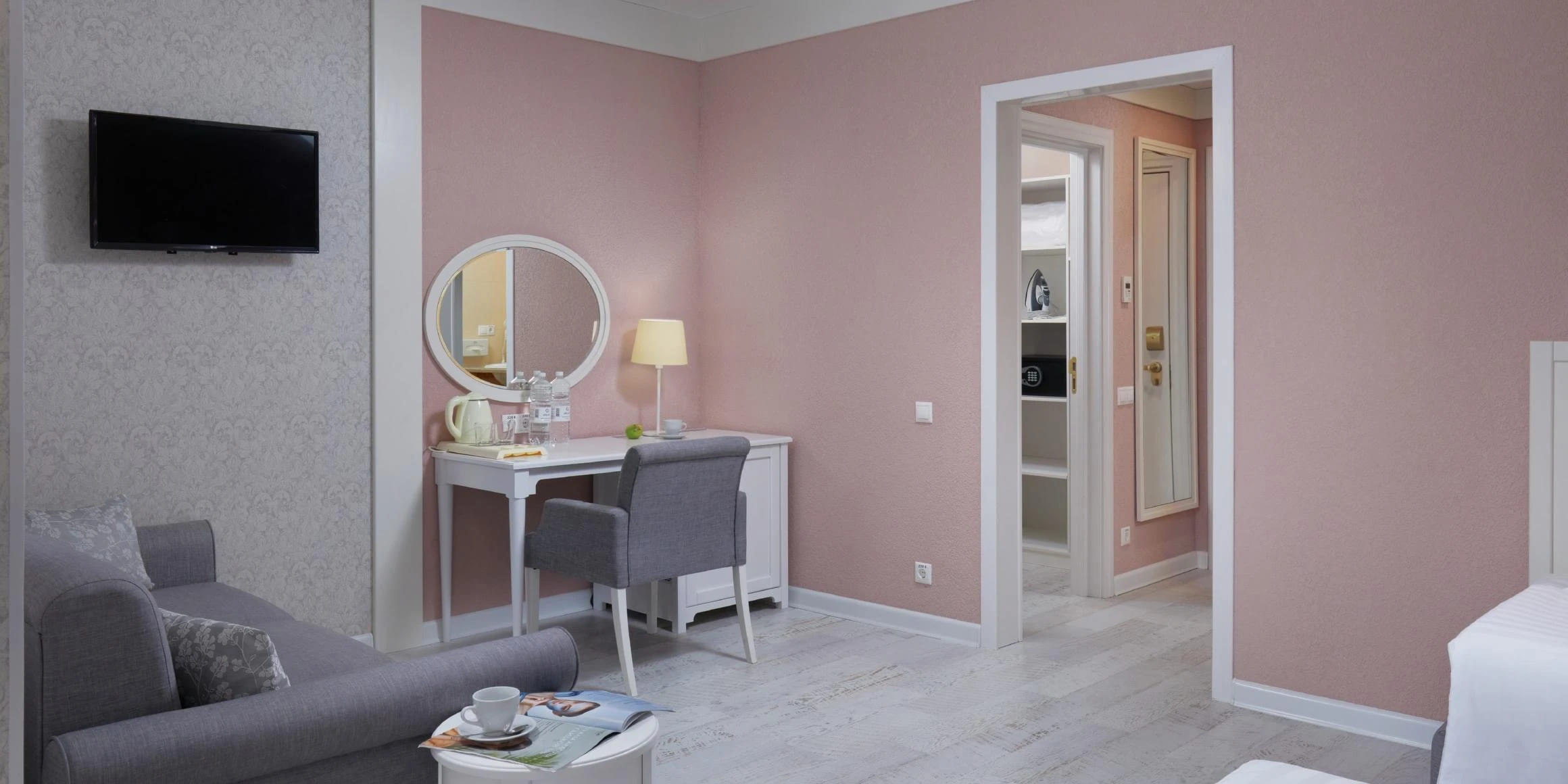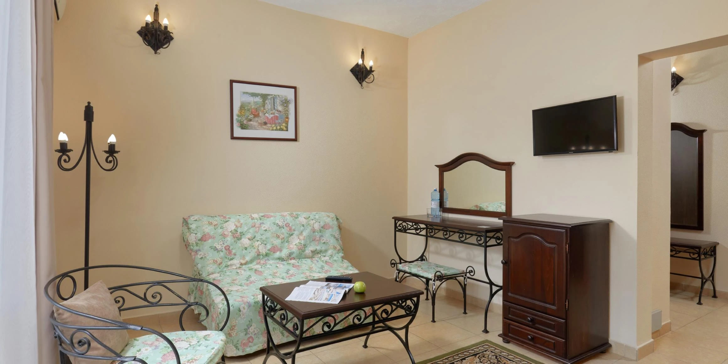 Люкс «Дольче Вита» 2-комнатный 47 кв.м (2 доп. места). Балкон оборудован сушилкой. Мебель: двуспальная кровать, журнальный столик, зеркало, кресло 2 прикроватные тумбочки пуфик, раскладной диван, стулья, туалетный столик, шкаф, мини-холодильник, набор посуды, сейф, сплит-система, два ЖК телевизора телефон, чайный набор посуды, электрочайник. Санузел: с ванной, таз, тапочки, туалетные принадлежности, фен, халат