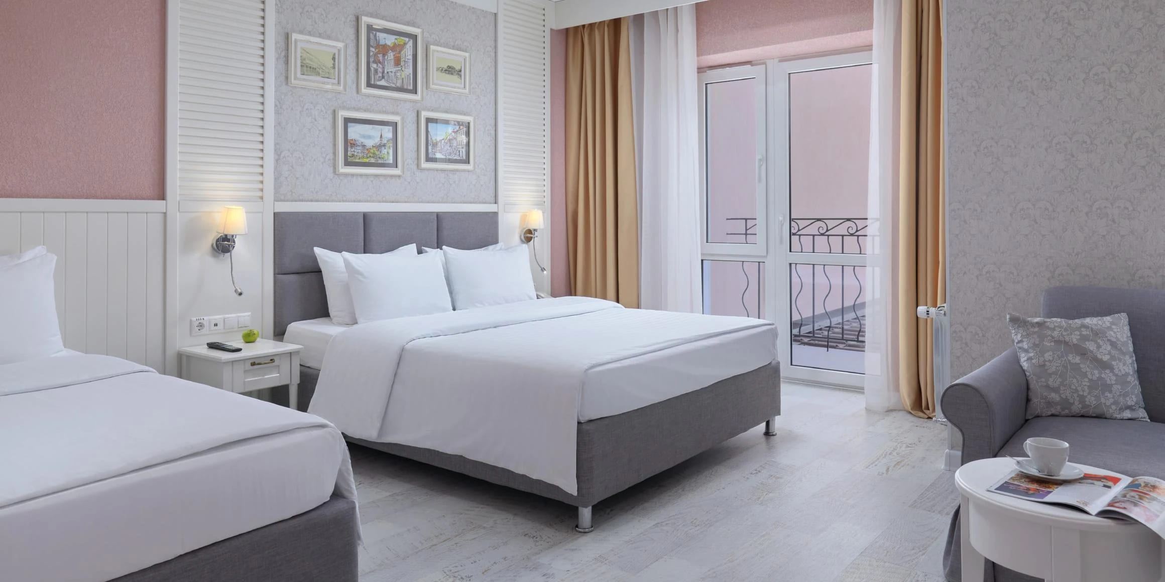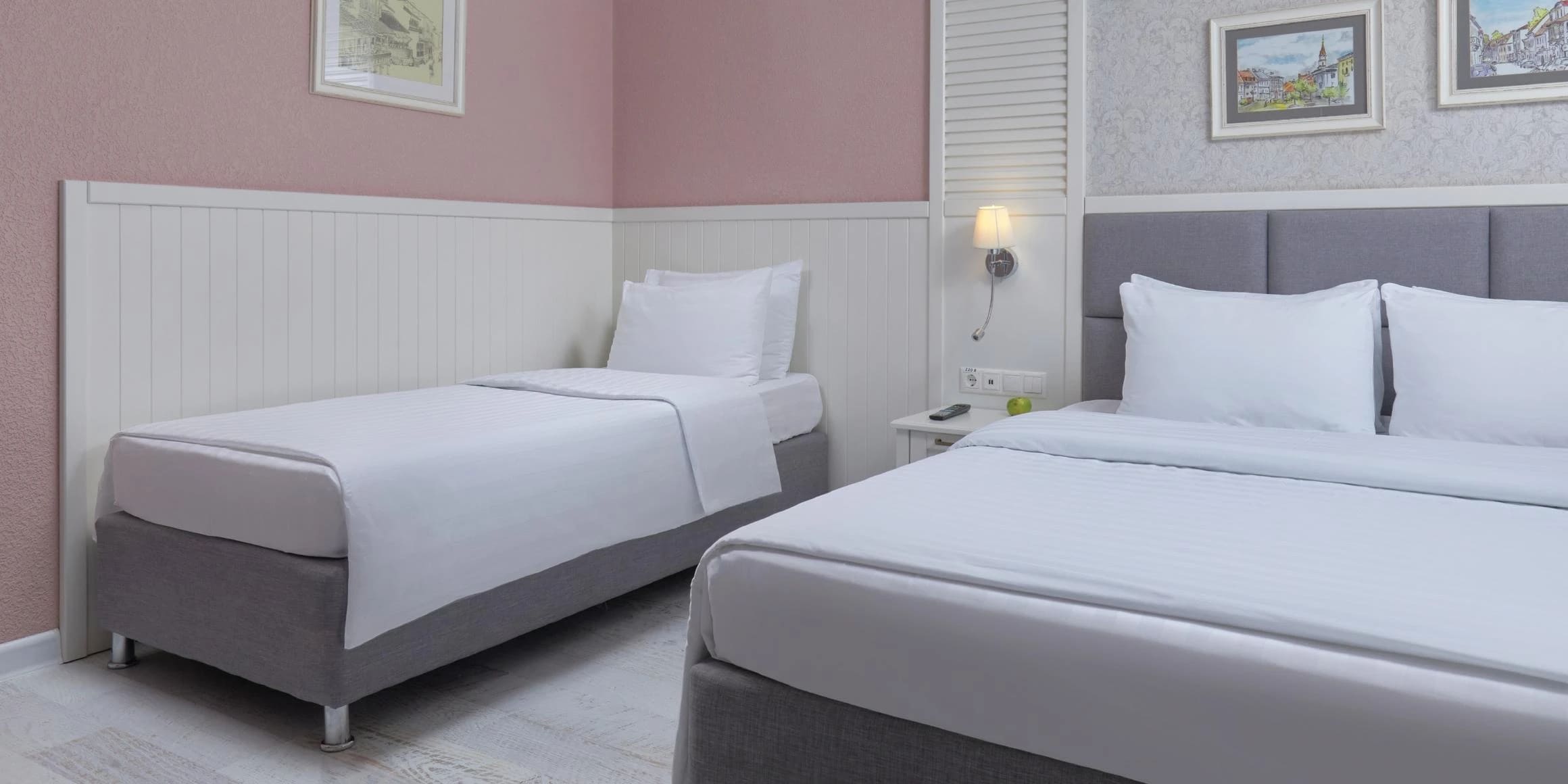 Семейный супериор 4-местный 2-комнатный 40 кв.м (без доп. мест). 1 спальня: две односпальные кровати/одна двухспальная, прикроватная тумба/прикроватные тумбы, туалетный столик, зеркало, стул/пуф, сплит-система, телефон (внутренняя связь). 2 спальня: две односпальные кровати, прикроватная тумба, стол-тумба, холодильник, телевизор, журнальный столик, два стула, сплит-система. Прихожая: шкаф, багажная полка, зеркало. Санузел: ванна, фен, комплект полотенец: банное, для лица, для ног; на основные места: халат, тапочки, шапочка для душа, гостиничная косметика (по мере использования): шампунь-кондиционер, гель для душа, мыло.