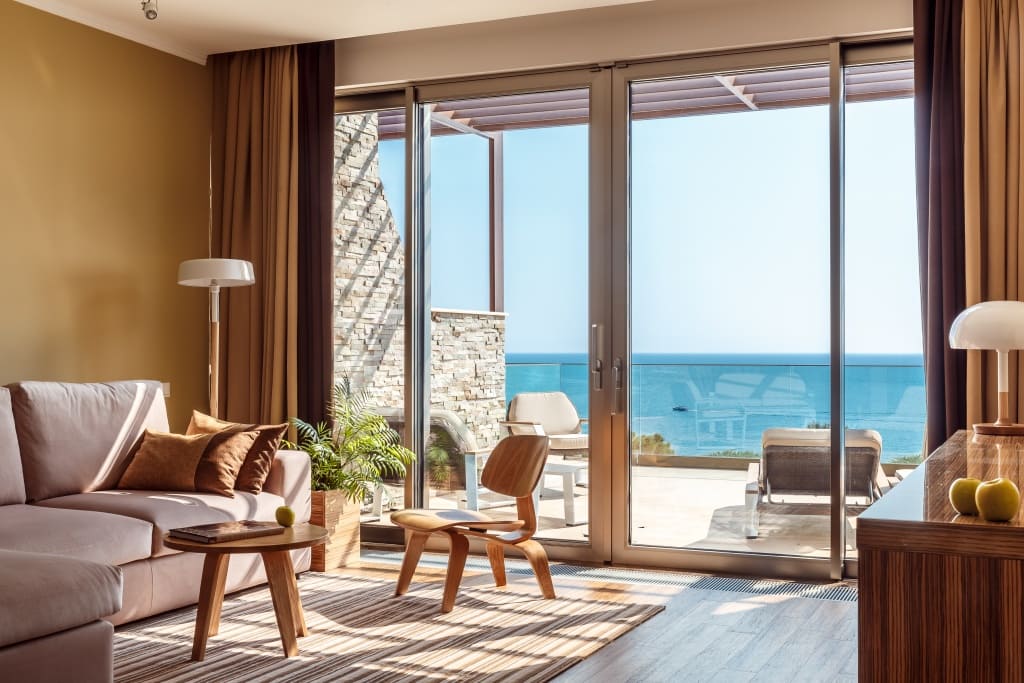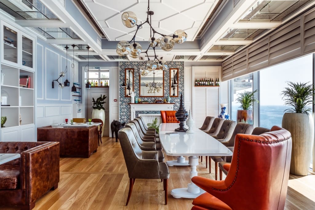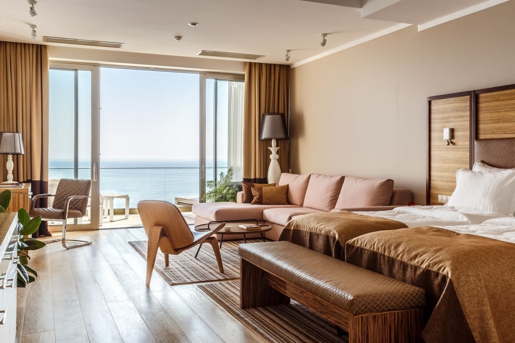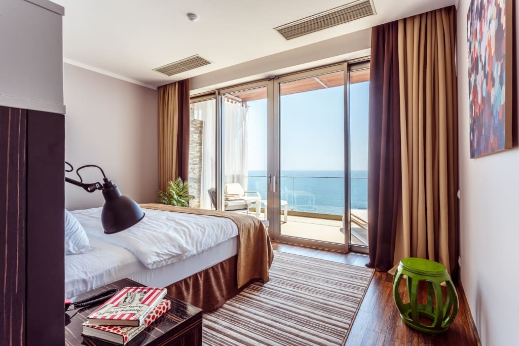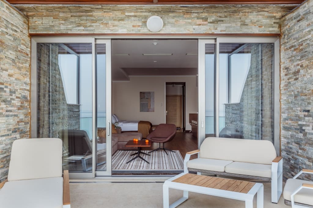 Апартаменты 4-местные 204 кв.м. На террасе: джакузи, мебель для отдыха из ротанга. В апартаментах: 4 санузла, 2 спальни, 1 кабинет, 1 гостиная со столовой зоной. Общая комната может служить, как местом отдыха для всех гостей, так и конференц-площадкой. По запросу номер оснащается демонстрационным оборудованием и мебелью для проведения бизнес-встреч и переговоров, при этом открывая великолепную морскую панораму.