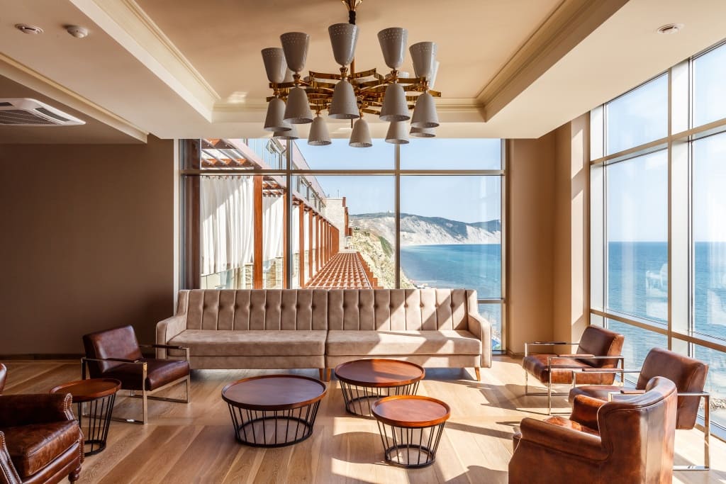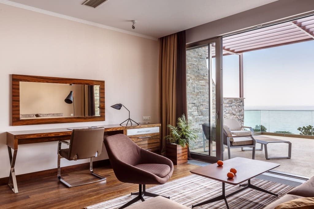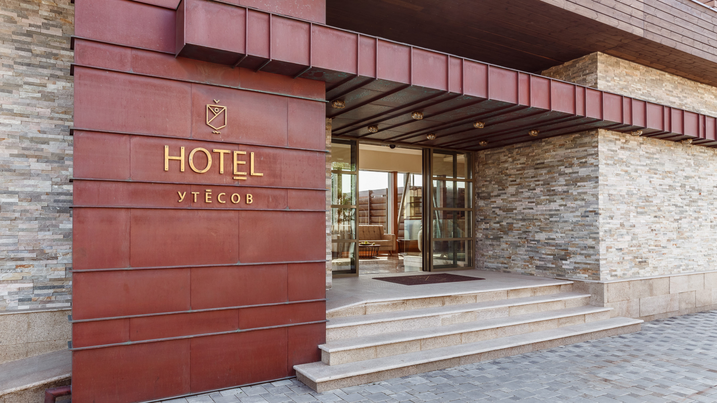 Junior Suite с террасой 2-местный 1-комнатный 73 кв.м (2 доп. места). Мебель: прикроватные тумбочки, диван, кресло, шкаф, журнальный столик, стул, торшер, светильник, багажная тумба, вешалка, зеркало. Элементы декора. Деревянная мебель изготовлена из натурального ореха по специальному заказу отеля «Утёсов». В ванной комнате: душевая кабина, биде, халат, тапочки, фен, косметическое зеркало, набор полотенец, набор премиальной косметики, телефон. На террасе: диван, кресло с мягкими подушками и стол. Материал: ротанг.
