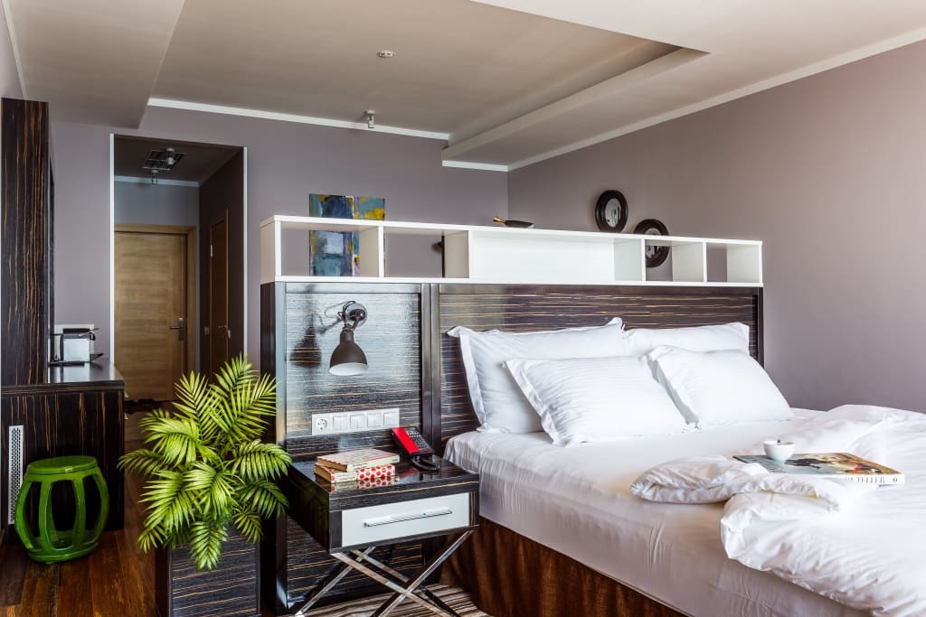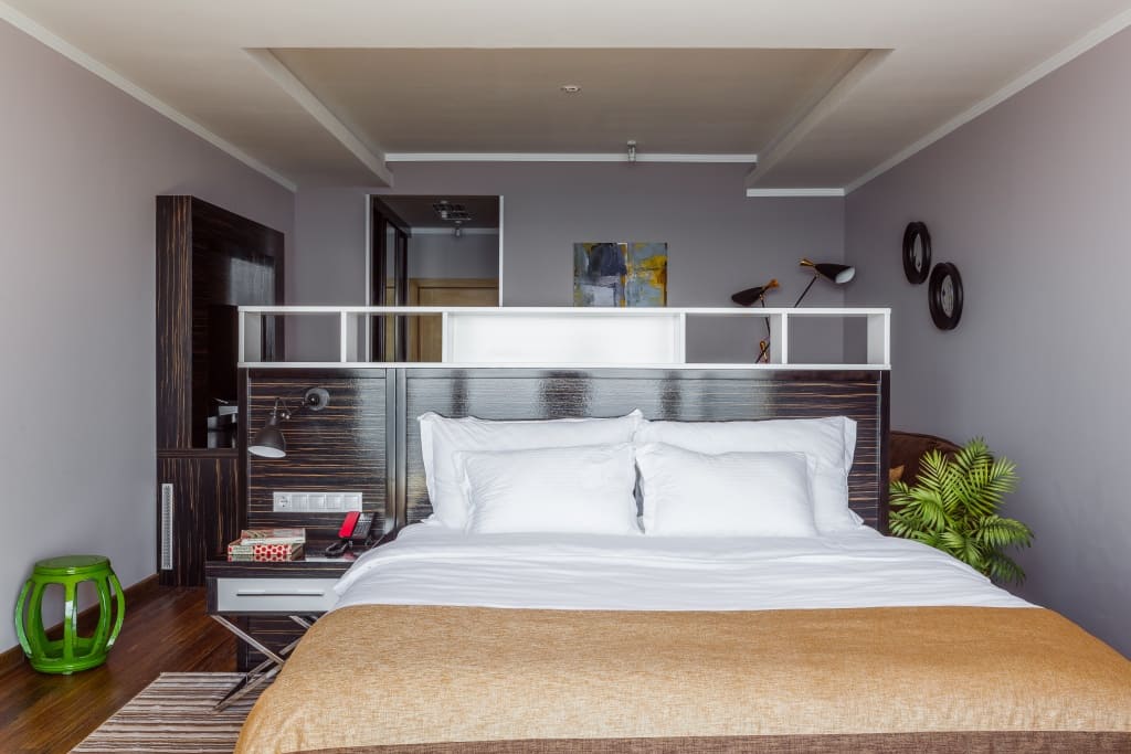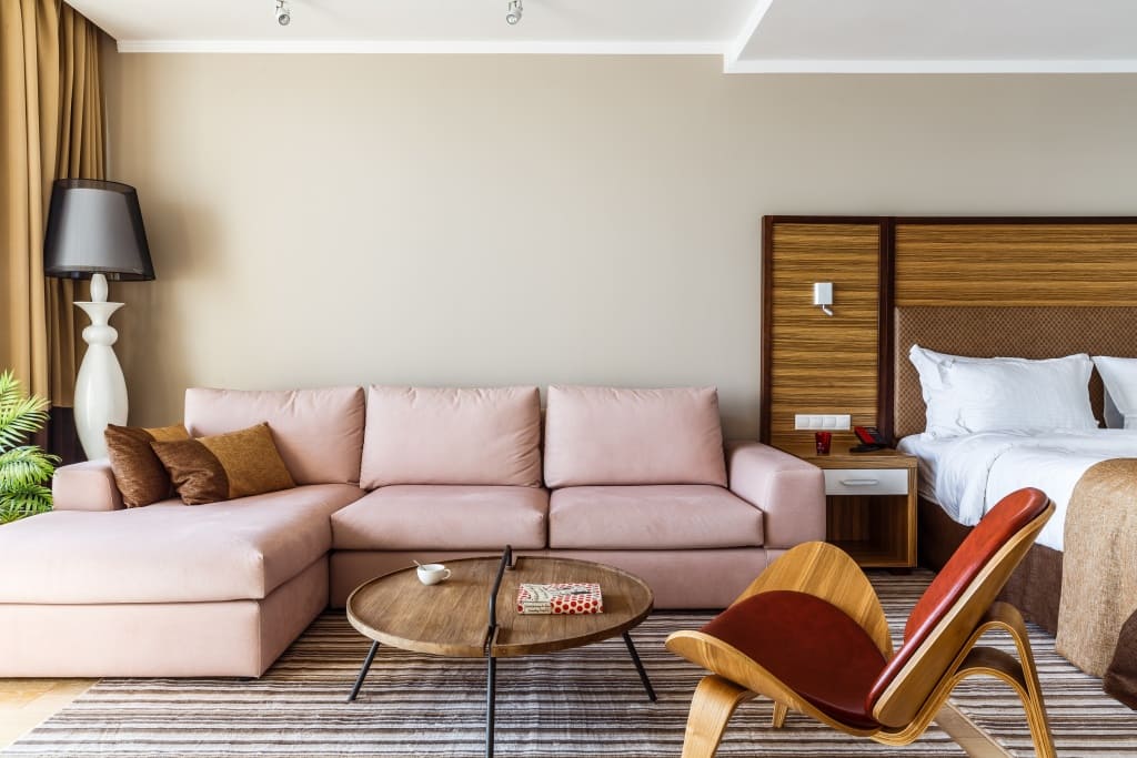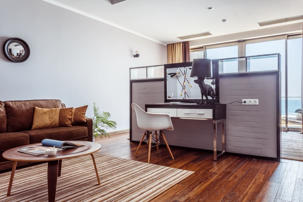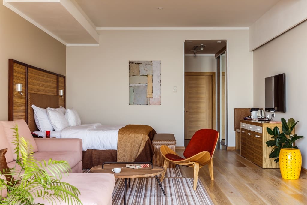 Junior Suite Дизайн 2-местный 1-комнатный 58 кв.м. (2 доп. места). Мебель: прикроватные тумбочки, диван, кресло, шкаф, журнальный столик, стул, торшер, светильник, багажная тумба, вешалка, зеркало. Элементы декора.