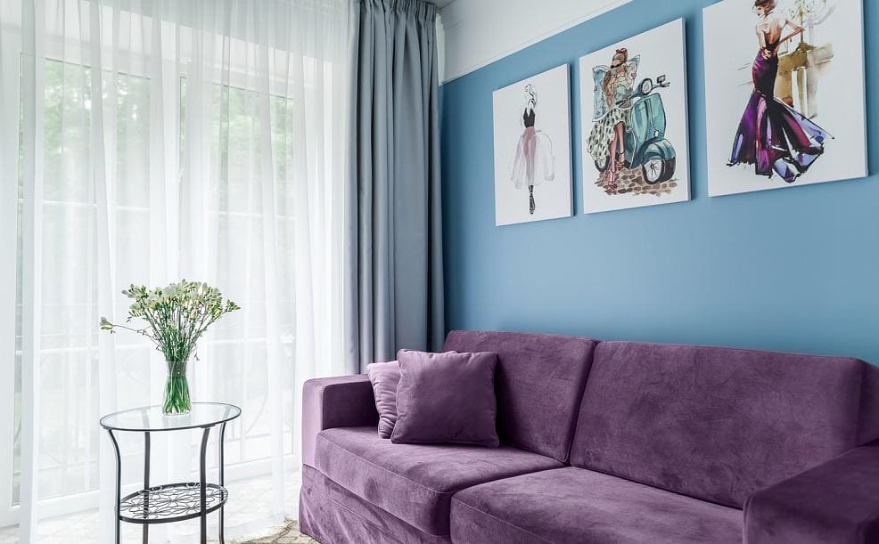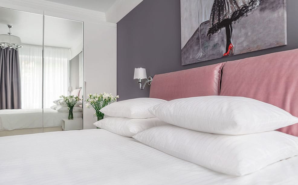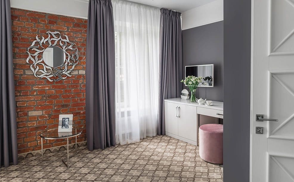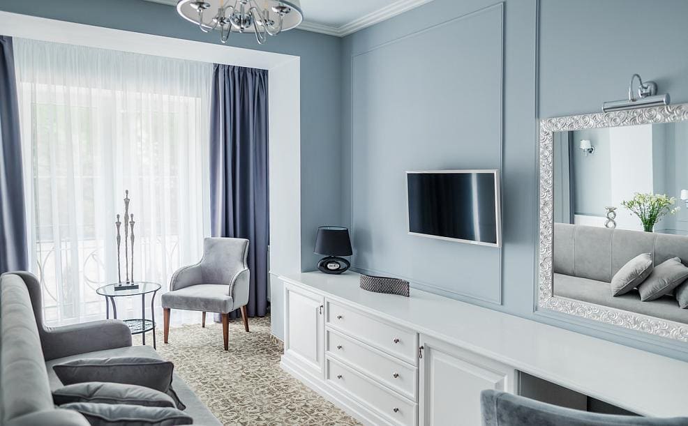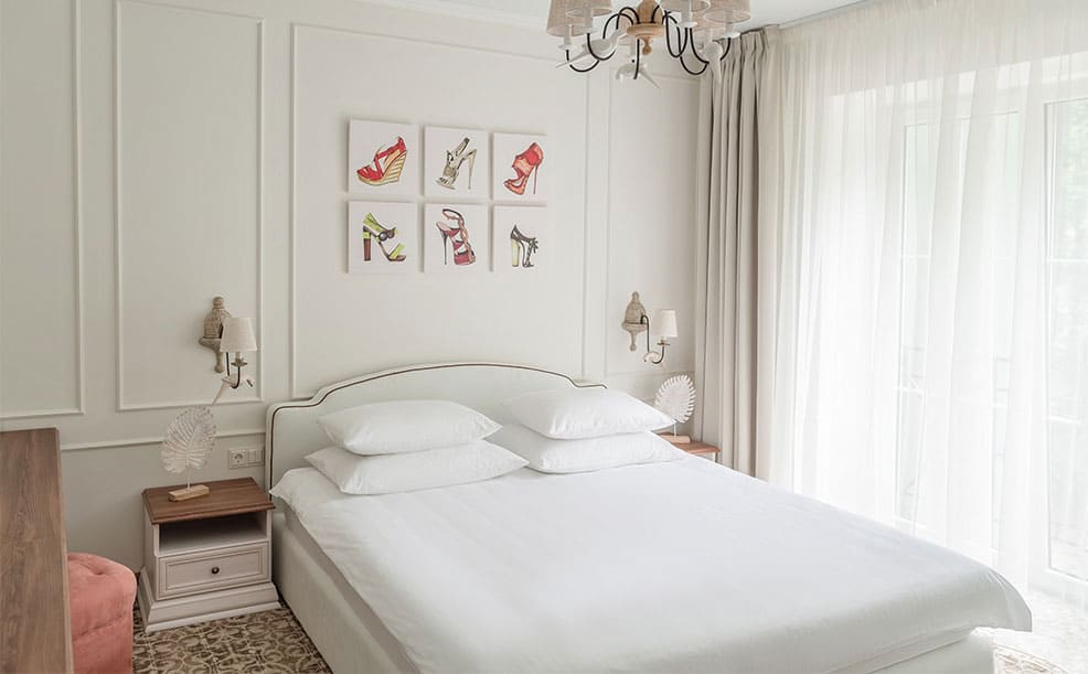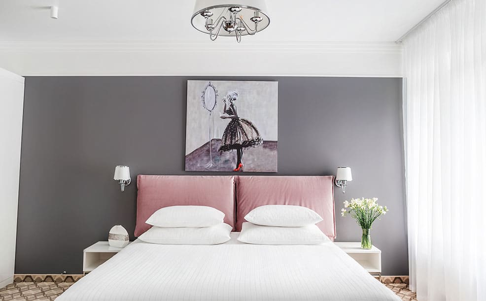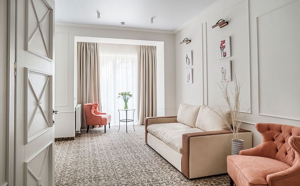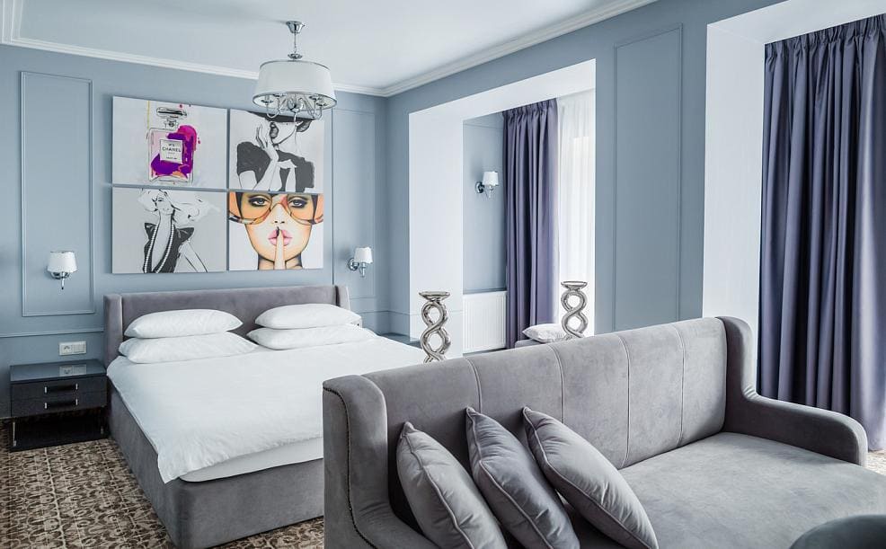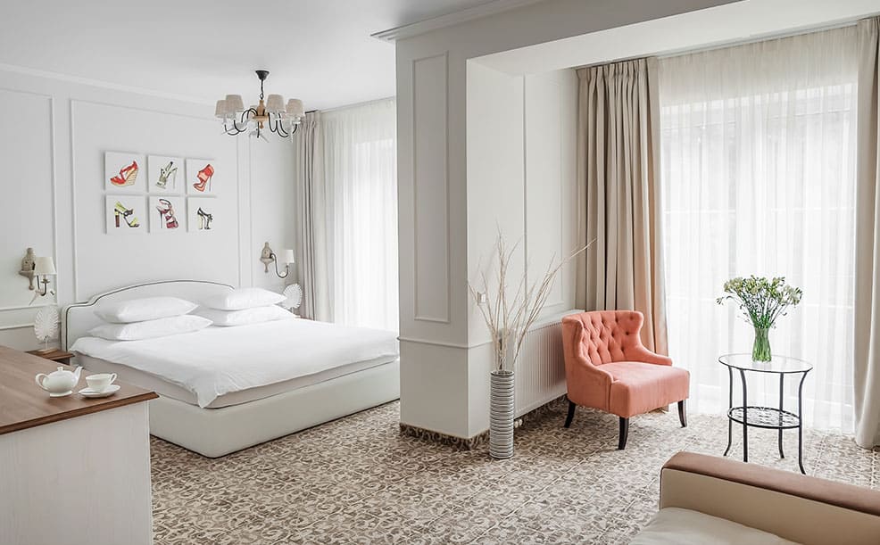 Делюкс Комфортабельные номера площадью 40 метров состоят из гостиной, гардеробной и спальни. Уникальный светлый и просторный интерьер каждого номера дополнен дизайнерской мебелью, зеркалами и оригиналами авторских картин.