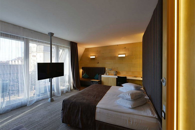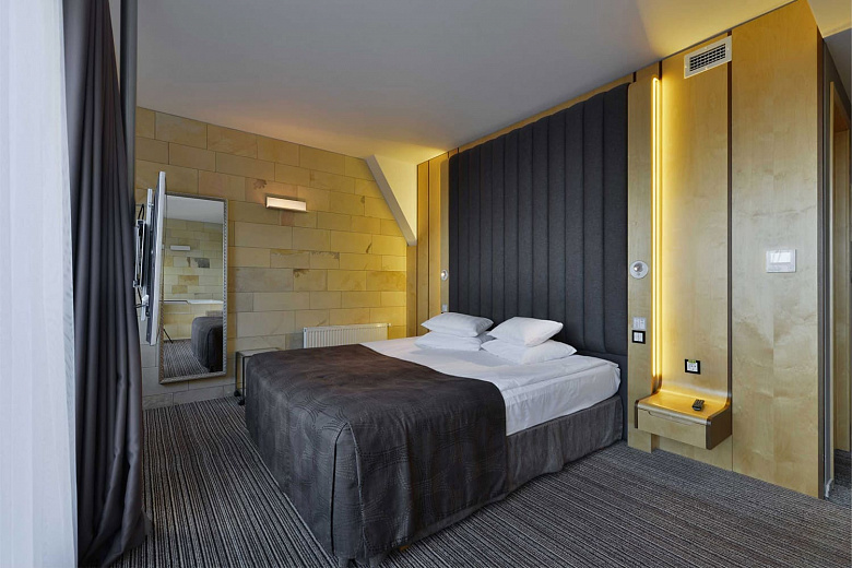 2-местный люкс (макс. 2+2 чел., 38 кв. м, телевизор, кондиционер, душ/ванна, умывальник, холодильник, сейф, мягкая мебель, шкаф/гардероб, стол, чайник, туалет). Доп. место - диван, может быть установлен без ограничения по возрасту.