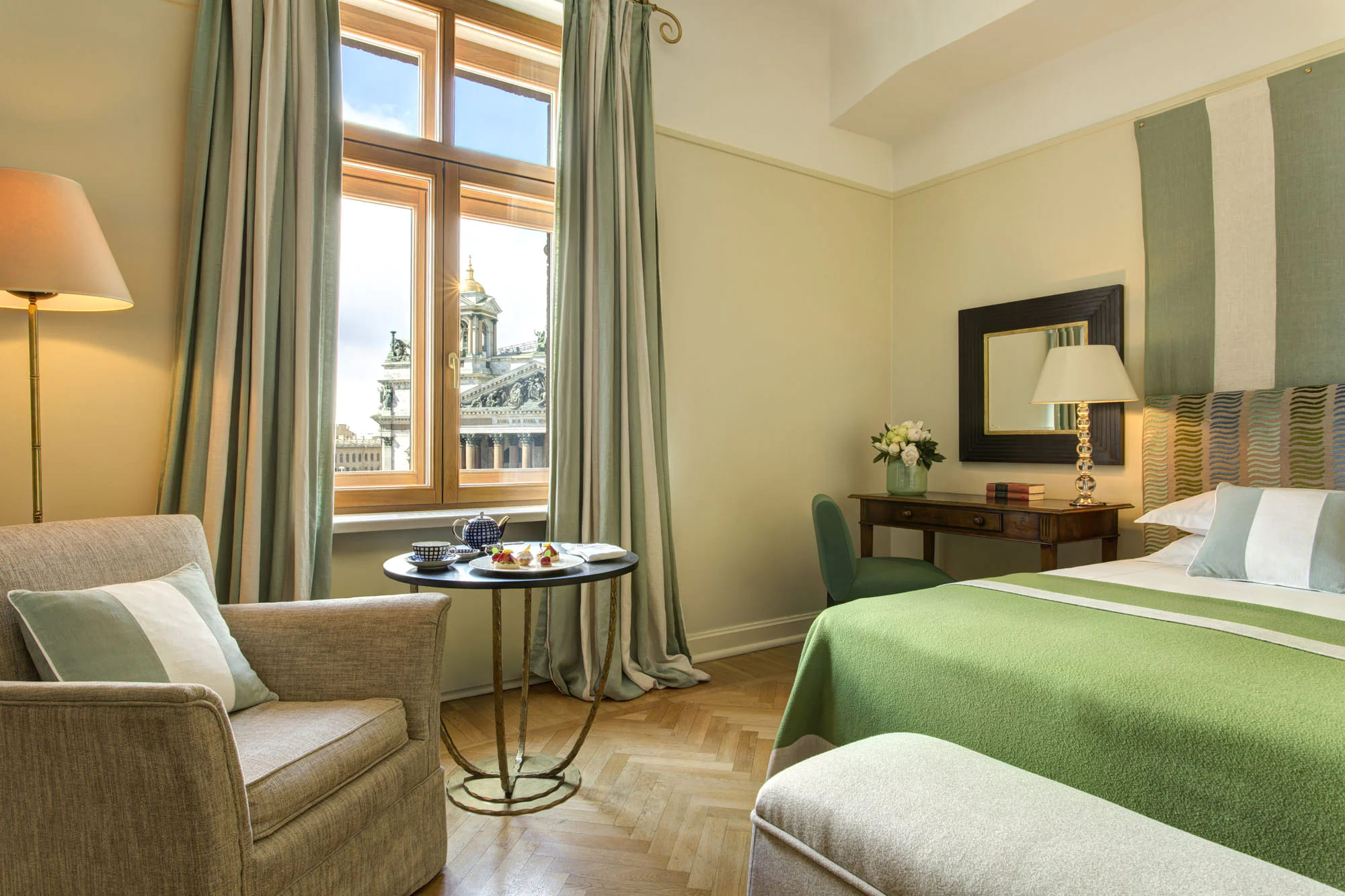 Superior deluxe room (25 кв. м): спальня с кроватью king-size или двумя отдельными кроватями, ванная комната. Вид на Исаакиевский собор.