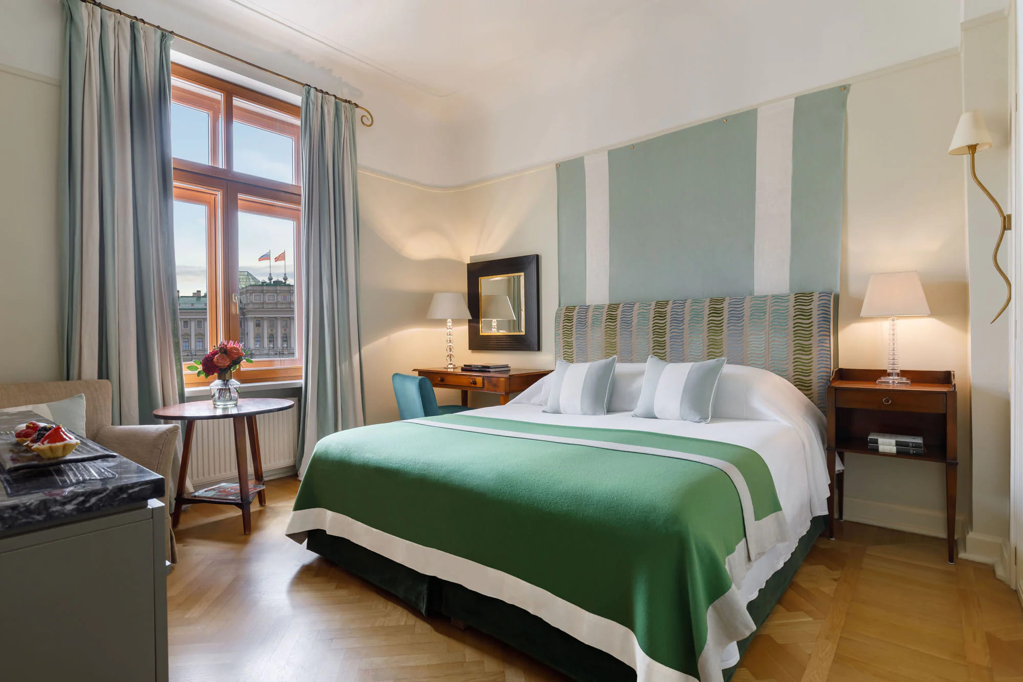 Deluxe room (25 кв. м): спальня с кроватью king-size или двумя отдельными кроватями, ванная комната. Вид на Большую Морскую улицу и Мариинский дворец. Возможно объединение с номером категории Classic suite.